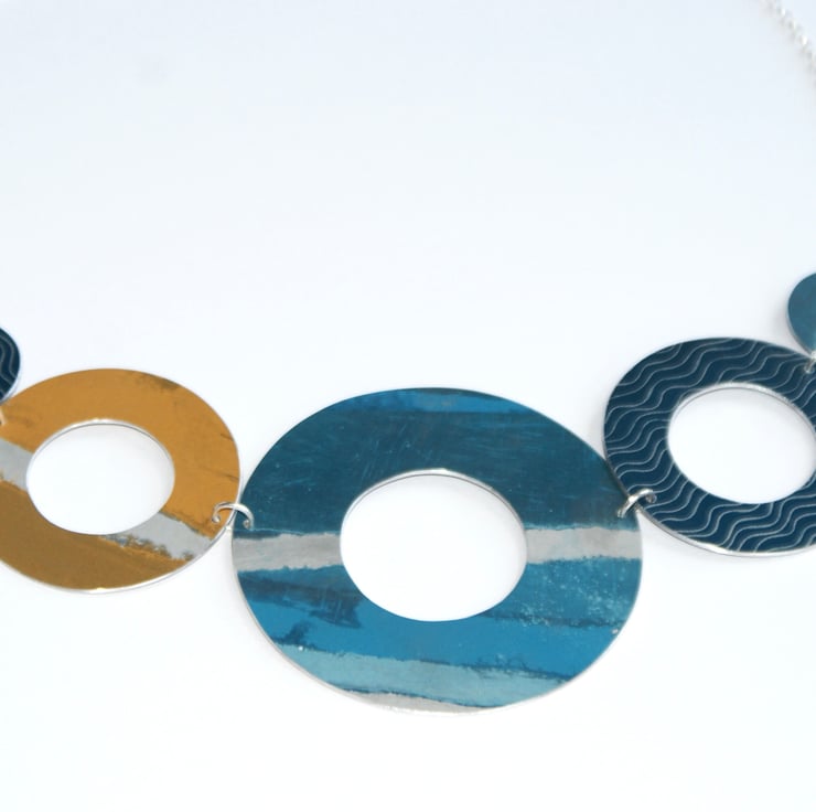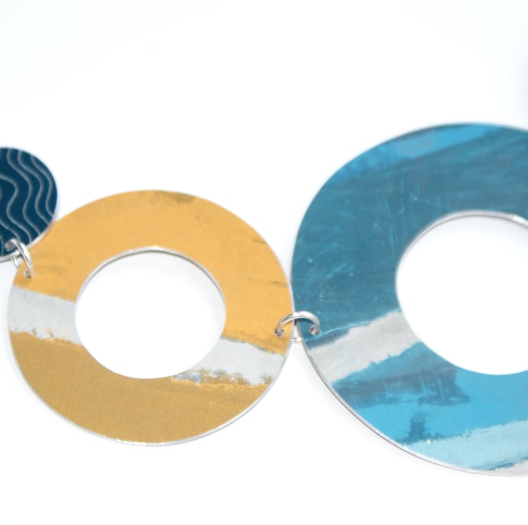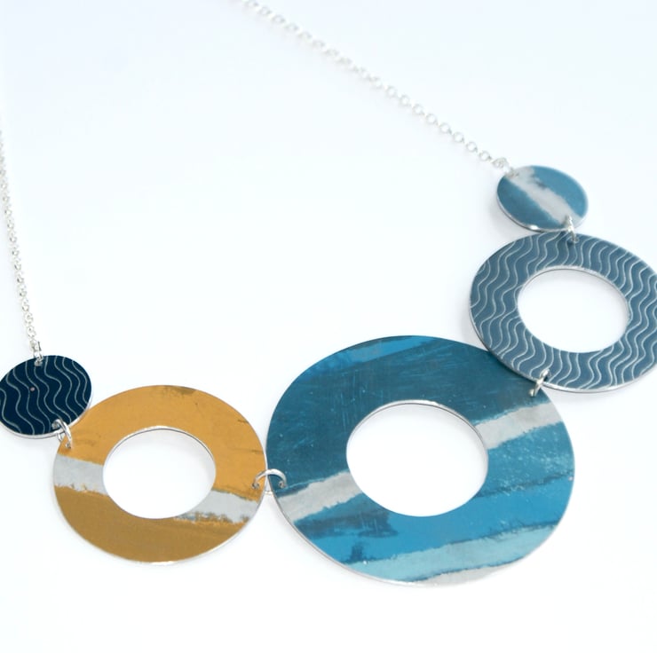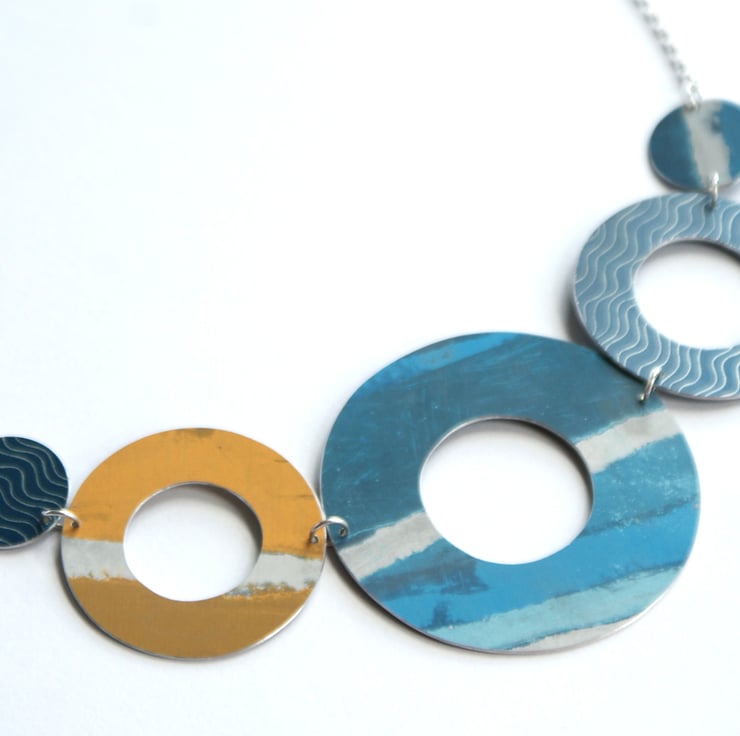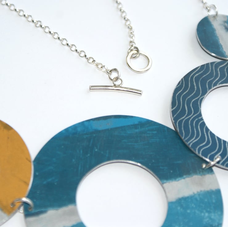 The colours of this multi piece necklace are sure to make your outfit pop. The pieces are inspired by my landscape paintings and are incorporated with my wave pattern to create a seaside feel. The coloured pieces are made from anodised aluminium which has been hand cut and dyed and hung from a sterling silver chain with a handmade toggle clasp.