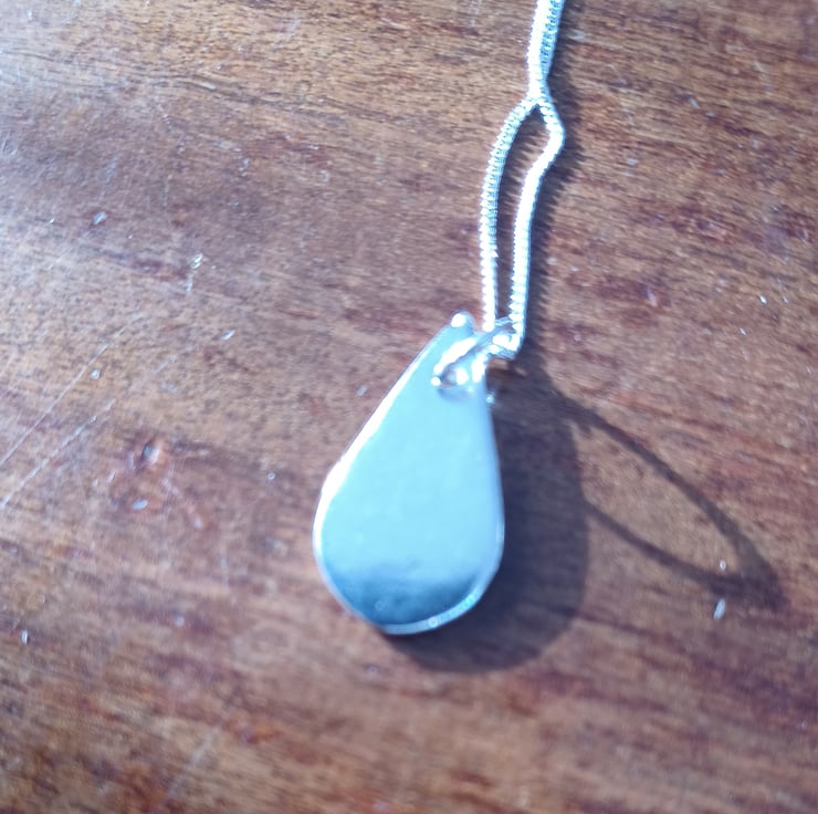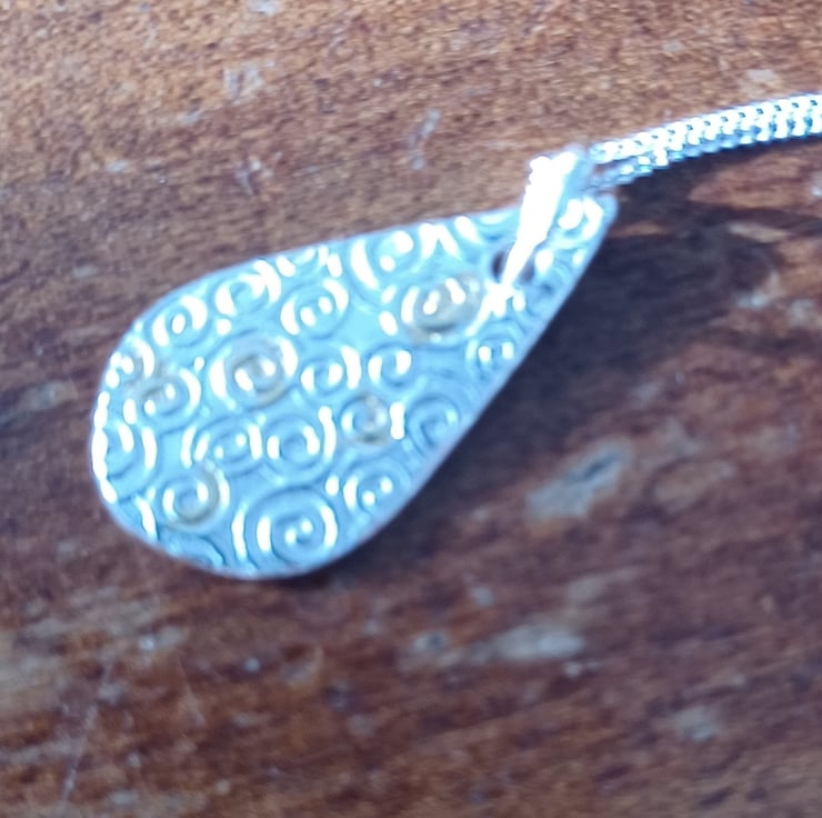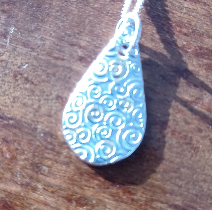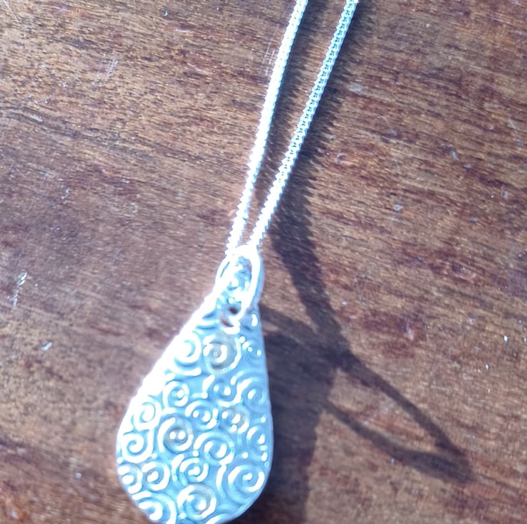 A pretty handmade fine silver teardrop pendant, textured with silver and gold plated swirls. The pendant is 2cm long and 1cm wide. It is attached to a fine 45cm (18") sterling silver curb chain, fastened with a bolt clasp.