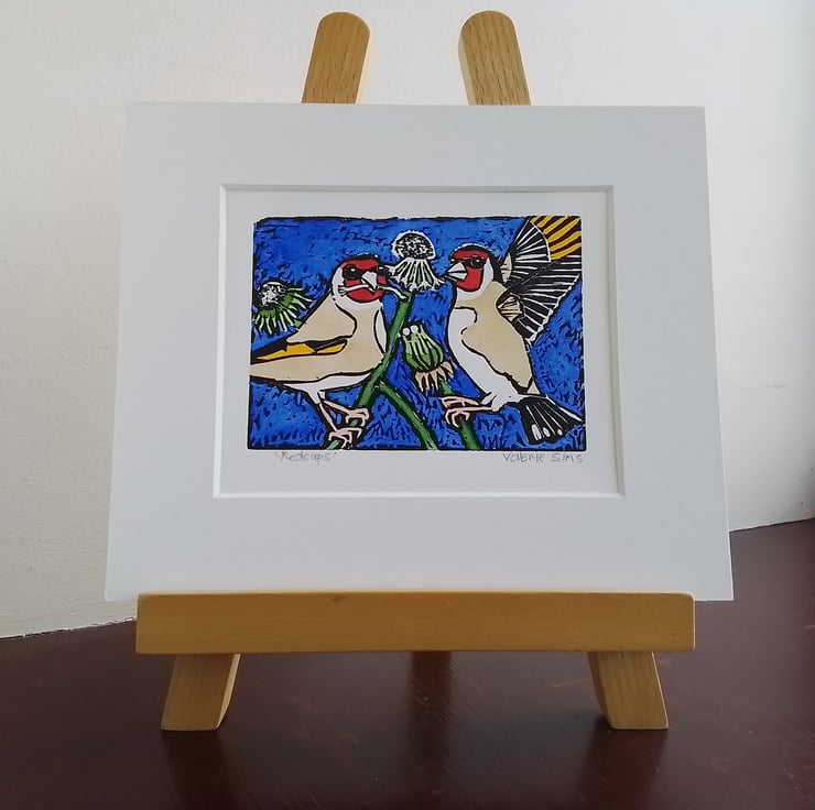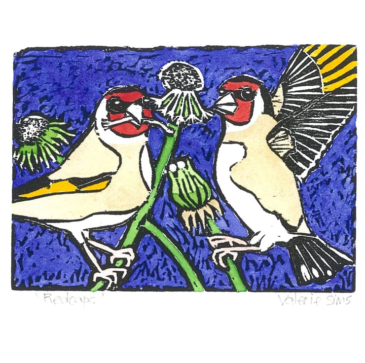 I watched these goldfinches eating the seeds of dandelions in my back garden. I couldn't resist depicting them in their bright red and yellow finery.