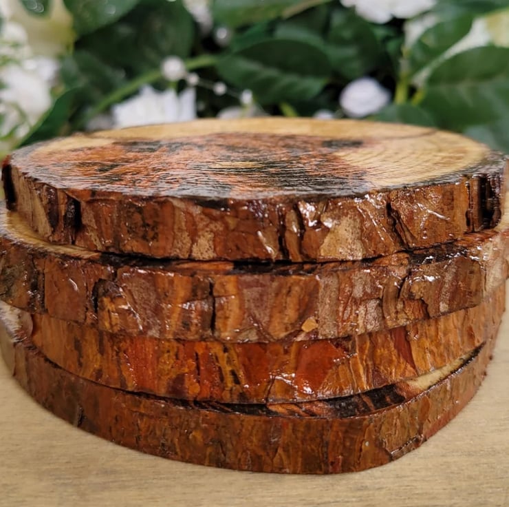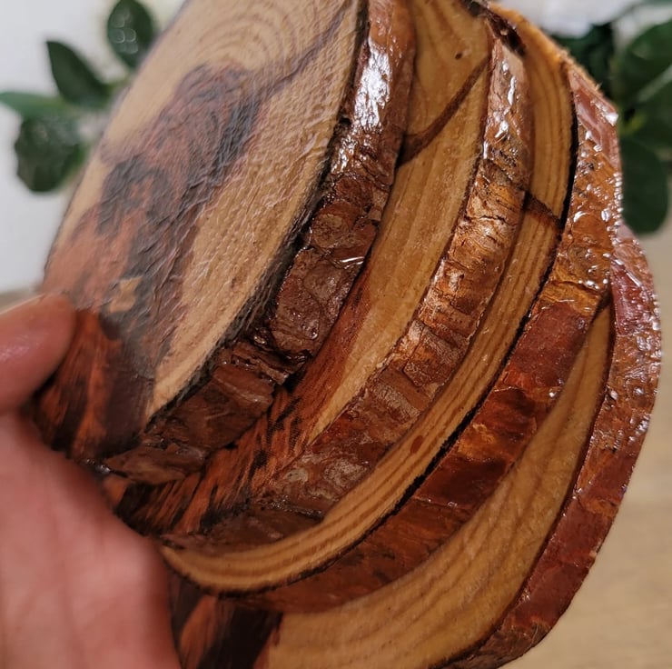 Once you see these, you'll want them all over the place! These unique, rustic wooden coaster sets make a wonderful gift and will look great on any table top. Each is decoupaged, using a paper napkin and gel medium with a beautiful Highland cow design, leaving the bark left on so you get a really authentic look. The reverse side is left plain. They are varnished with an interior varnish first and then varnished again with a gloss yacht varnish to give them protection