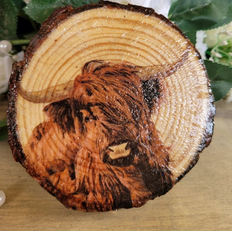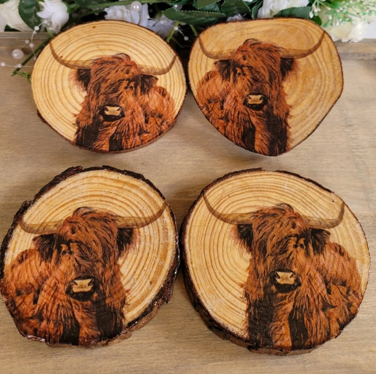 Cow lovers rejoice!! - you're finally in luck. Natural pine wood slices transformed into a set of four gorgeous wooden Highland cow coasters!