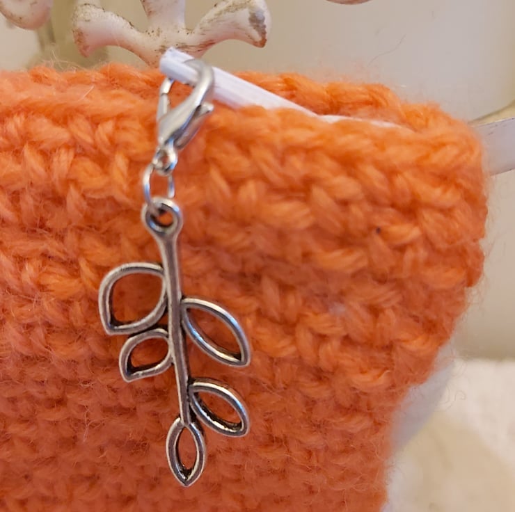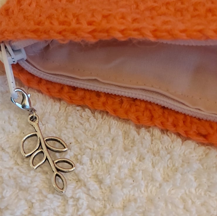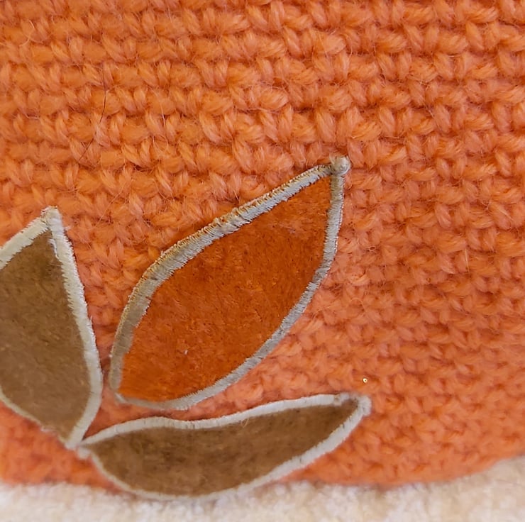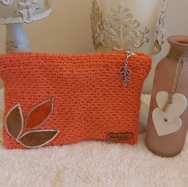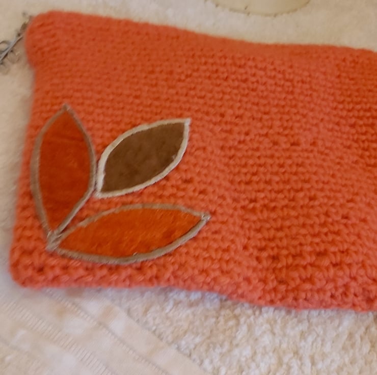 Coral pink? orangezip up case. handmade in double crochet. 3 velvet leaves in the corners back and front. onr side one brown enclosed by 2 orange ones either side. On the other side one orange enclosed by brown ones either side.these are secured by bondaweb and stitched at the points.