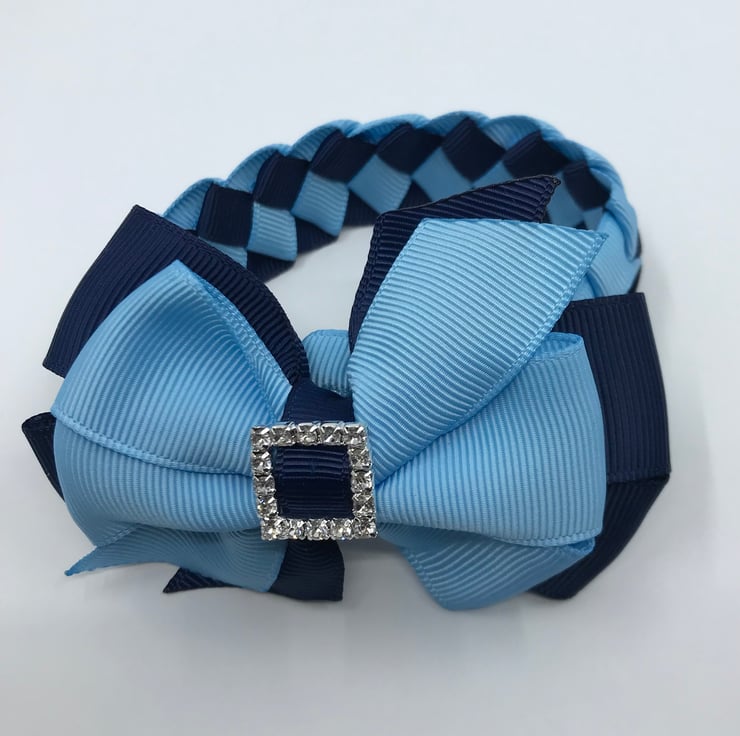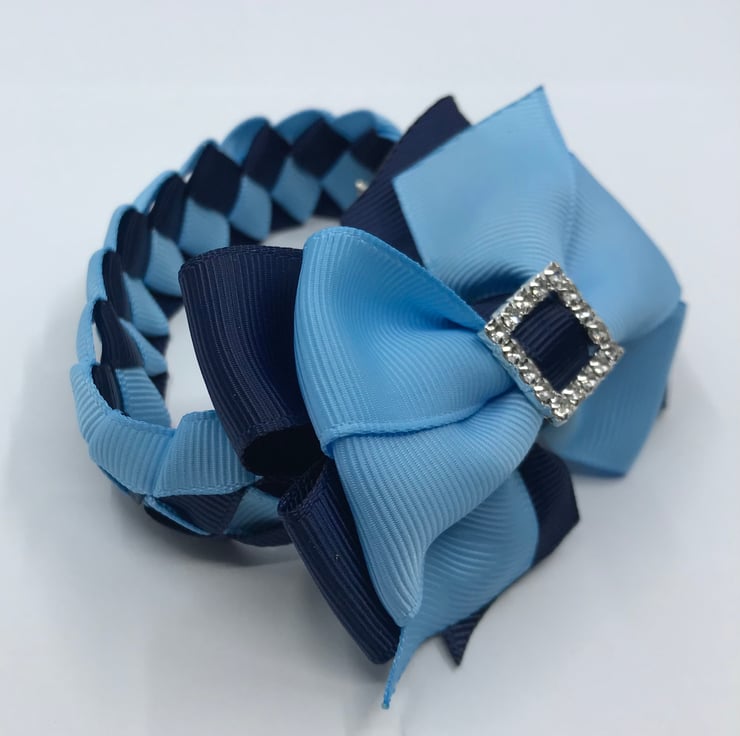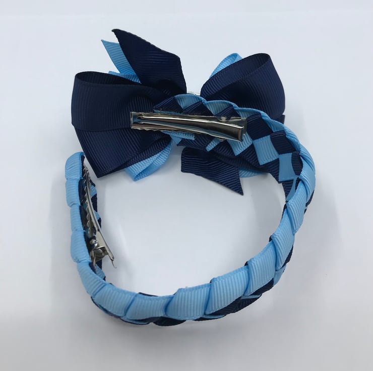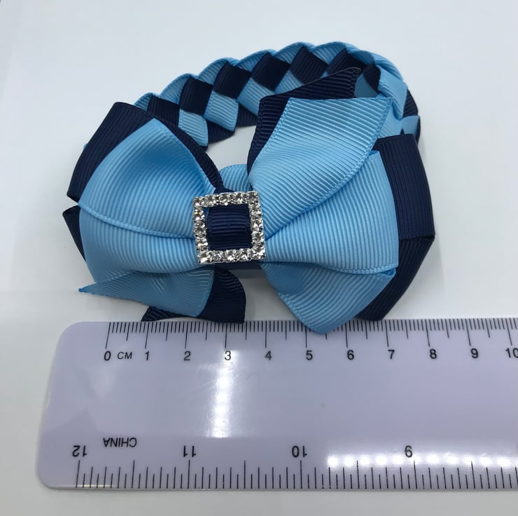 Our navy and light Bunwrap is handmade here in our little shop. It is made from the best quality Grosgrain ribbon. The Bunwrap is really elegant and look extremely smart wrapped around your little one's bun. It clips in at the front of the bun then the tail wraps around the bun and clips beneath the bow at the front to complete the look, tail is 21 cm.