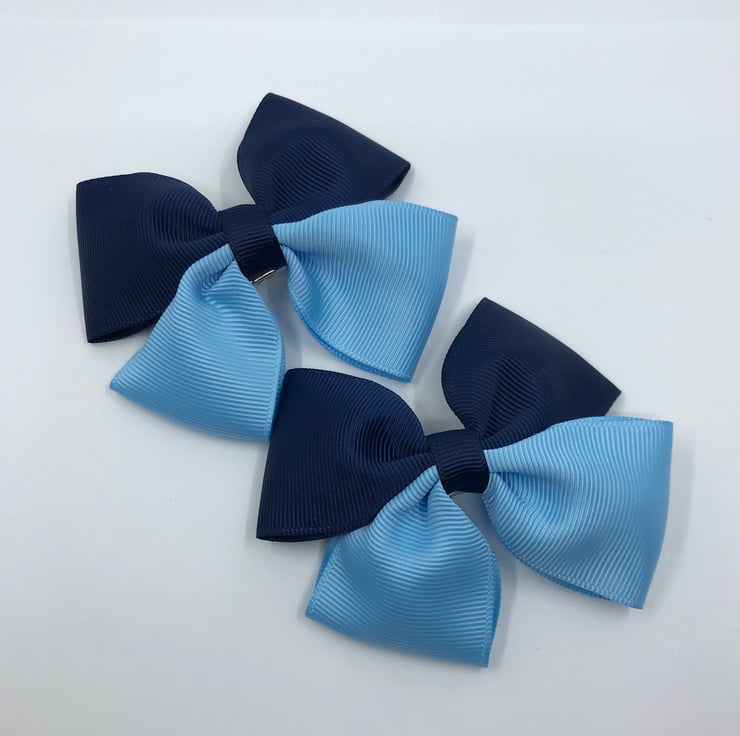 Our two tone double bows are handmade here in our little shop. They are made from the best quality Grosgrain ribbon. These bows are simple and classic and look extremely smart and go well with the navy and light blue School Uniform.