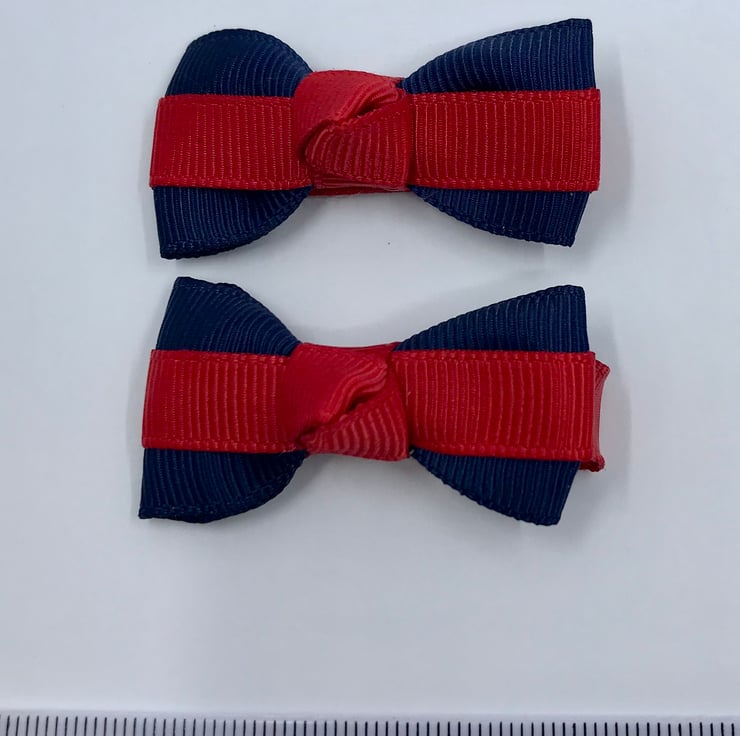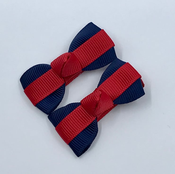 Our Itty Bitty navy and red clips are handmade here in our little shop. They are so cute and compliment any school Uniform with navy and red in it. They are ideal for keeping those sneaky little curls from straying into your little one's eyes.