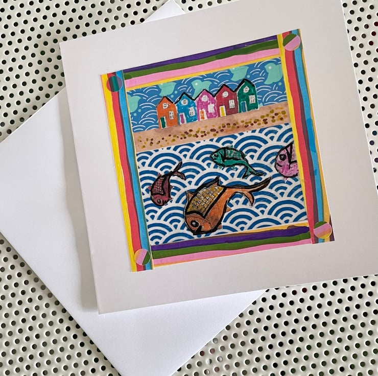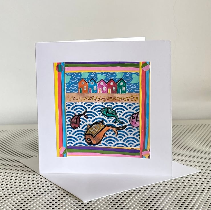 The card motif is a hand pieced collage depicting a quirky seaside scene.