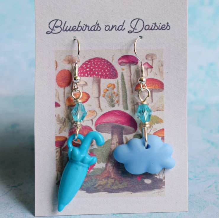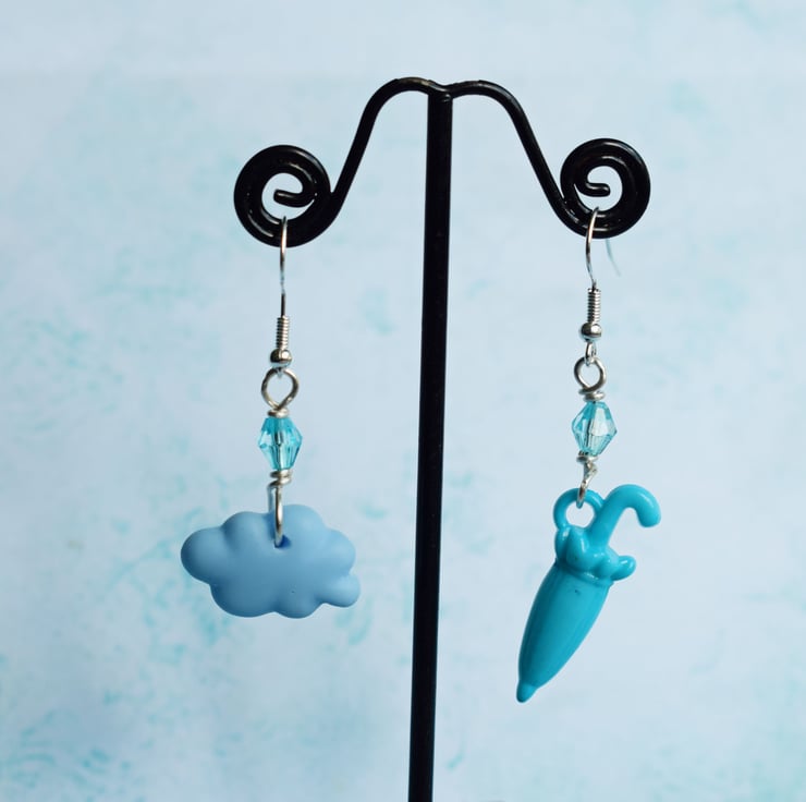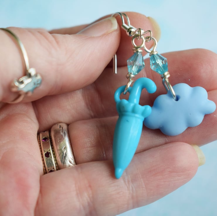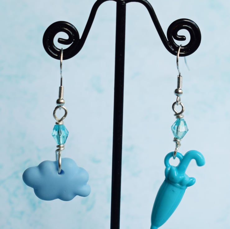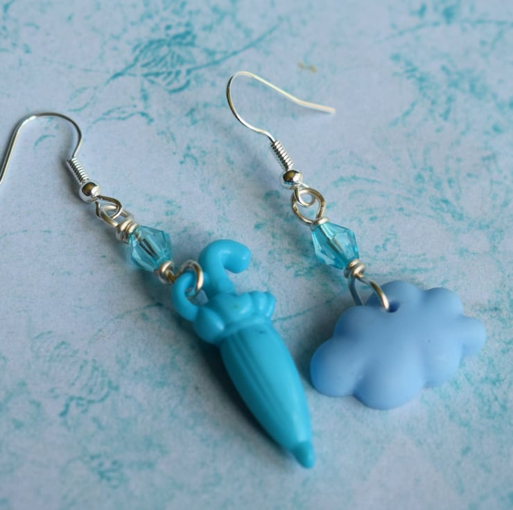 I have made some little resin clouds and then drilled them to hang them as charms and matched them with some little plastic umbrellas to make mismatched earrings. They are finished with blue acrylic beads and silverplated earwires but you can choose hypoallergenic stainless steel earwires if you prefer or, if you have unpierced ears, you can choose silverplated clip on fittings