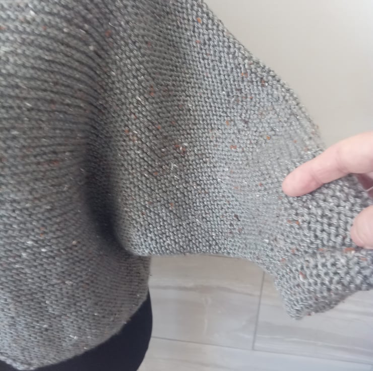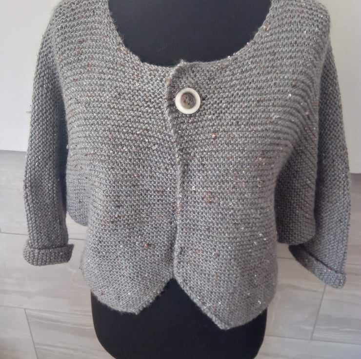 This is a cosy,casual cardigan, it has a batwing sleeve, three quarter length, with turn up cuffs,and a one button fastening.