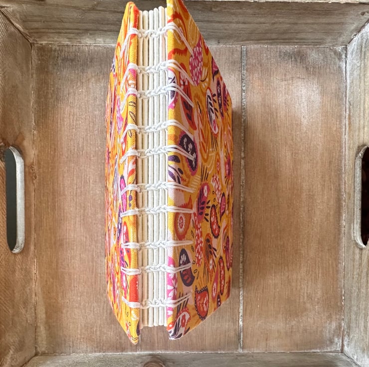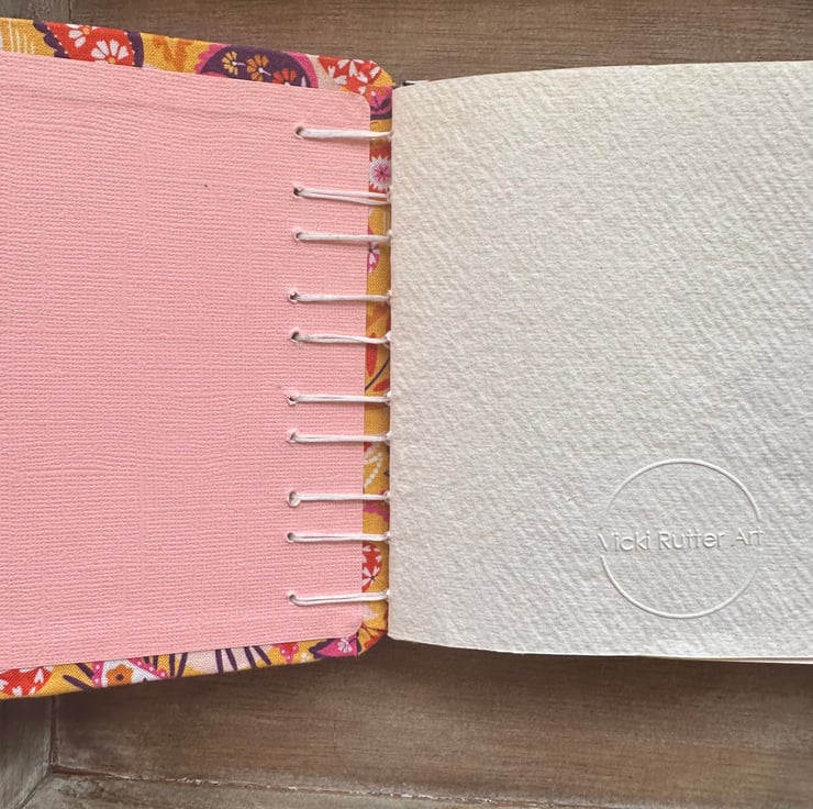 This is a lovely 48 page 14x14 cm sketchbook. It has been bound using Coptic stitching which is both beautiful and strong. It allows the pages to lay flat when the book is open, perfect for sketching and writing. Covered using paisley print cotton fabric and stitched with white thread.