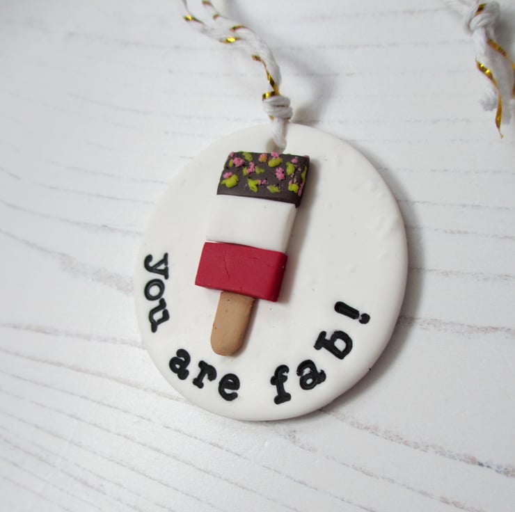A fun and cute decoration, hand made from white polymer clay, with a Fab ice lolly in the centre and hand stamped writing YOU ARE FAB around the edge, hand painted using black acrylic paint. There is also the option to add a face onto the Fab lolly too. Finished with a hole and twine string attached, ready to gift to your teacher.