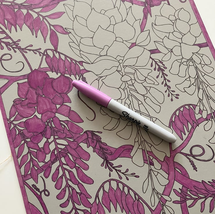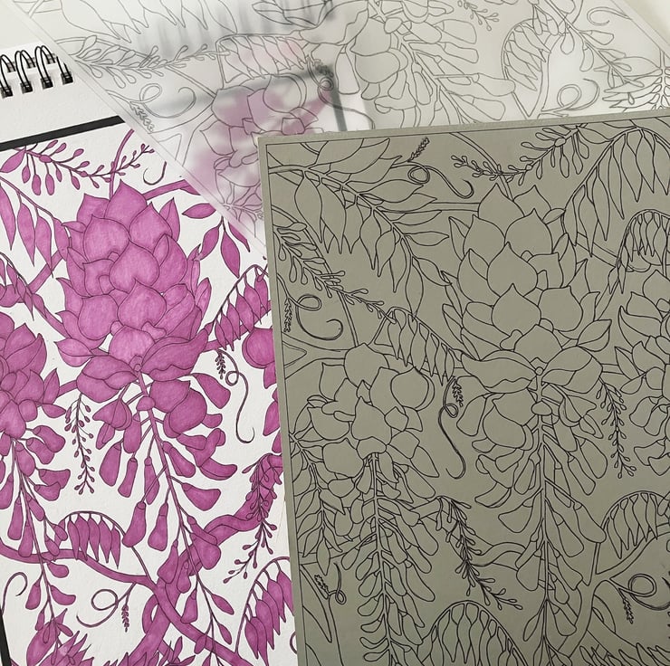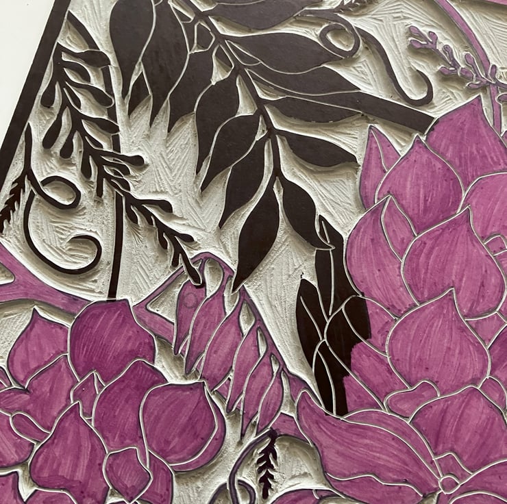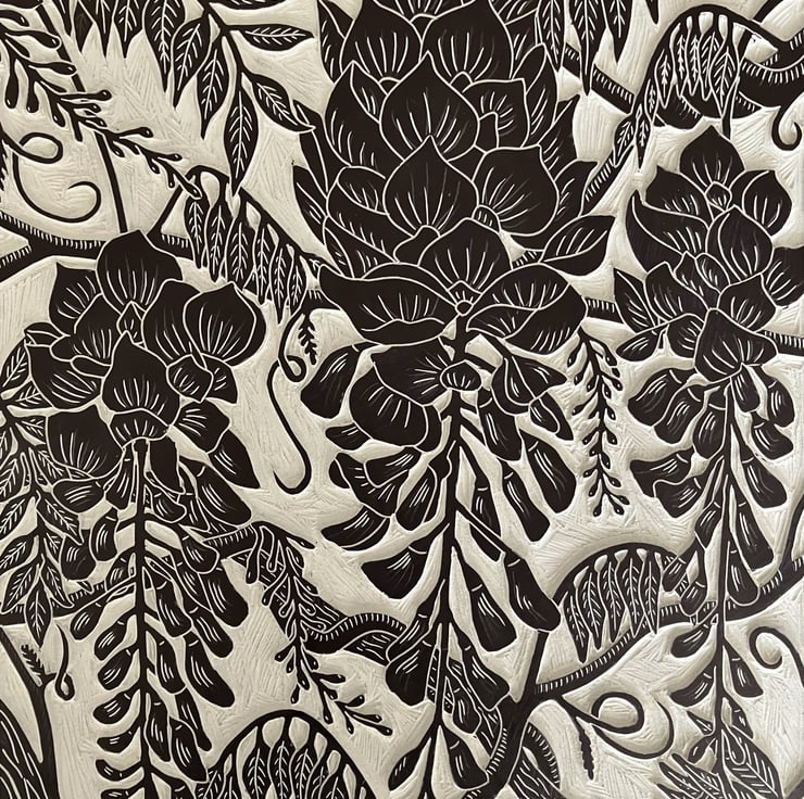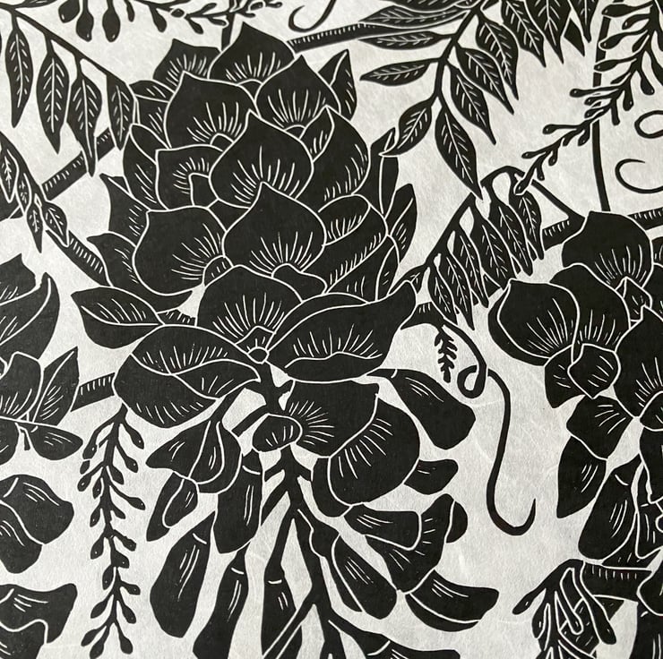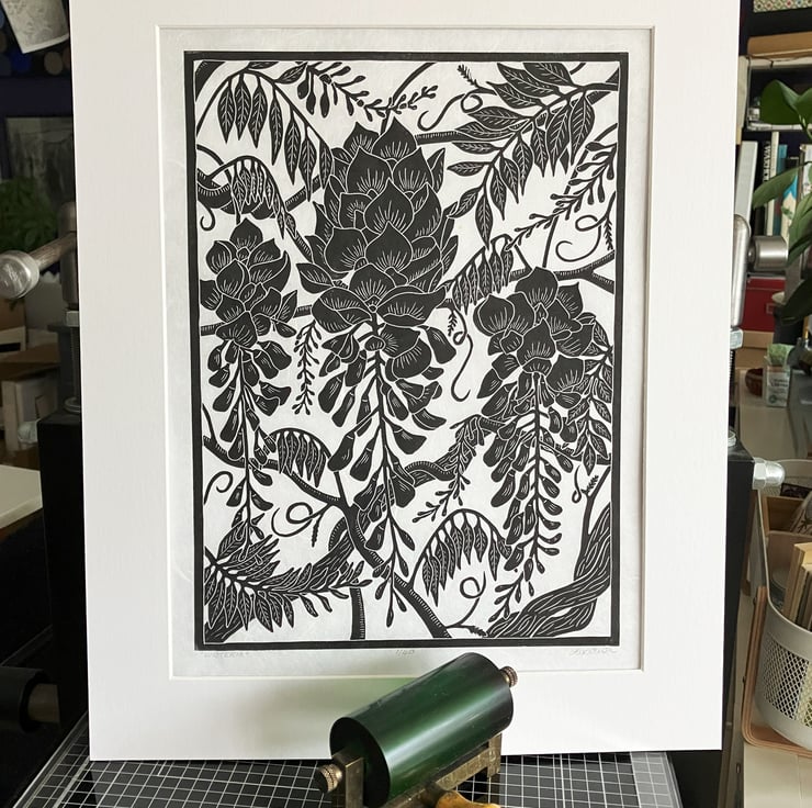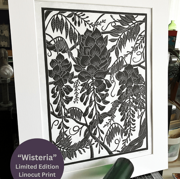 "Wisteria" is a hand printed linocut print featuring beautiful Wisteria blooms. This print is created from my original drawing which is transferred to the lino block in reverse and then carved by hand. Ink is then rolled onto the block and the paper laid onto the inked surface. The print is then hand burnished and the paper lifted from the block to reveal the print.