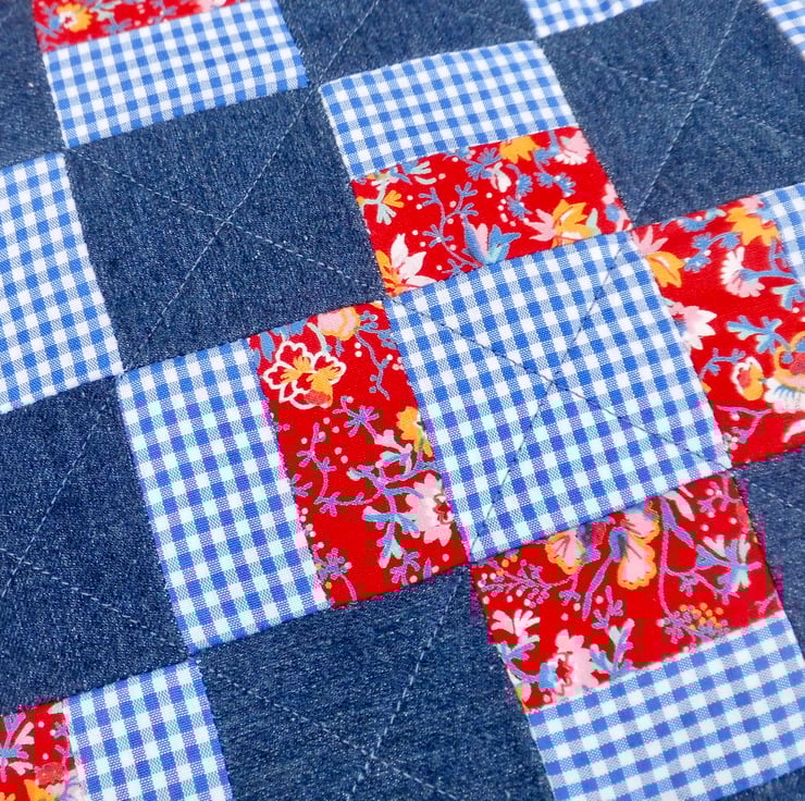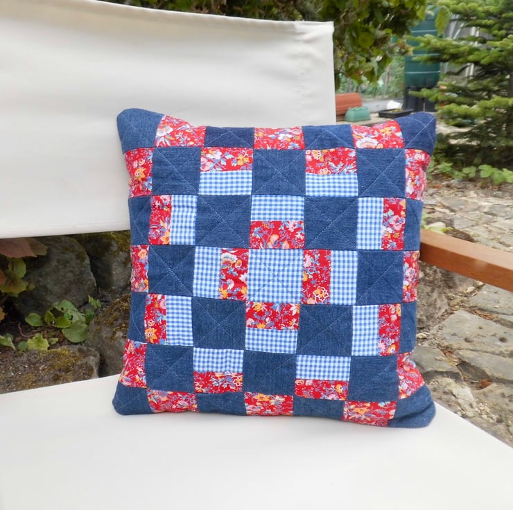 I made the front of this cushion using new fabrics but pieces which have been left over from other projects, enough to give me lots of 3" squares. Dark blue denim, small blue and white gingham check and a red and blue floral. I backed it with a layer of lightweight fleece, then a lining and then quilted it with diagonal rows of machine stitching in navy blue thread.