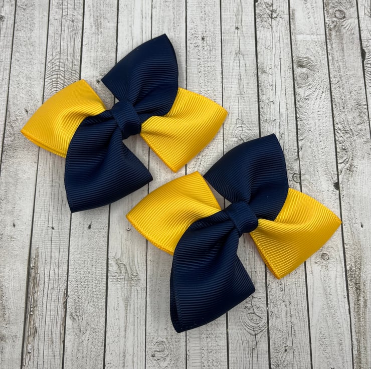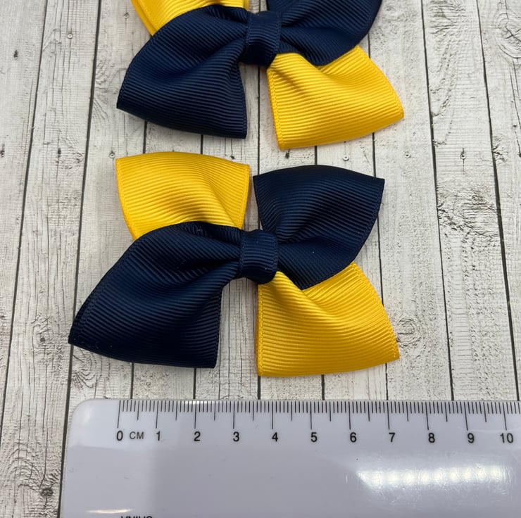 Our square double bows are handmade here in our little shop. They are made from the best quality Grosgrain ribbon. These bows are simple and classic and look extremely smart and go well with the navy and yellow gold School Uniform.