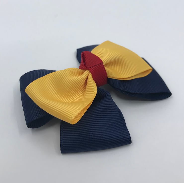 Our top knot bows are handmade here in our little shop. They are made from the best quality Grosgrain ribbon. These bows are really elegant and look extremely smart and go well with the Navy and Yellow Gold Uniform.