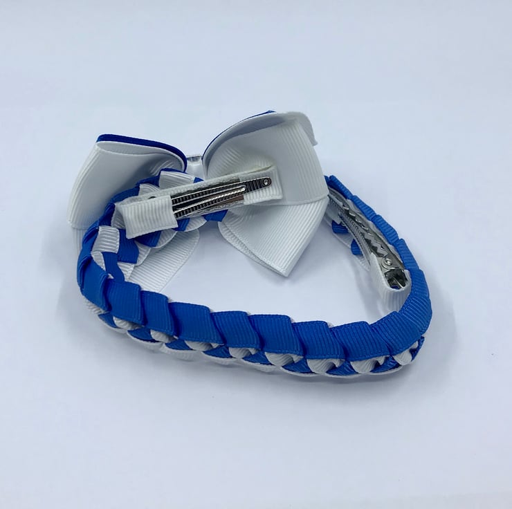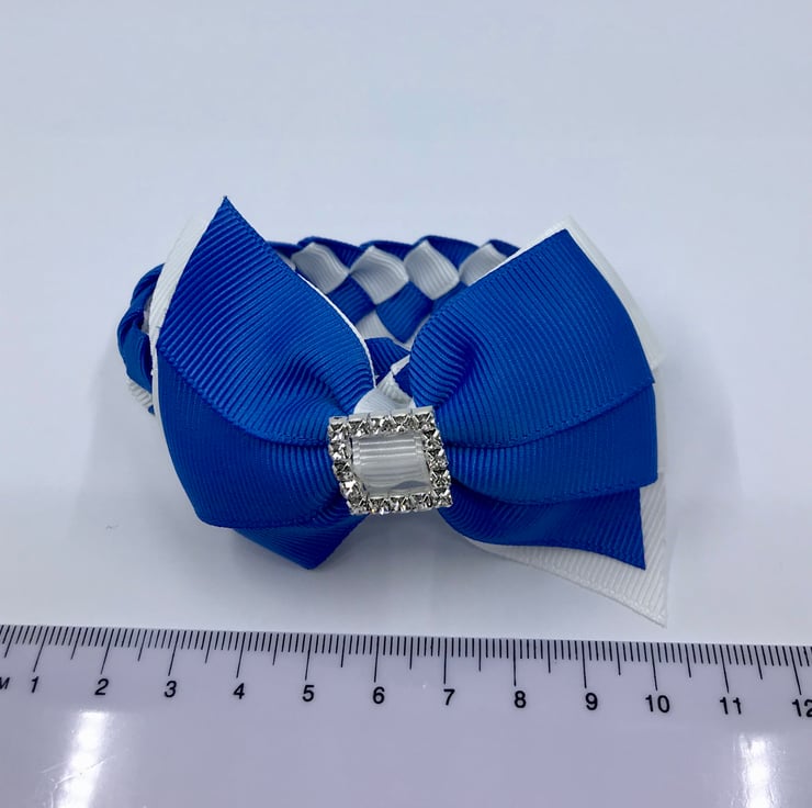 Our royal blue and white Bunwrap is handmade here in our little shop. It is made from the best quality Grosgrain ribbon. The Bunwrap is really elegant and look extremely smart wrapped around your little one's bun. It clips in at the front of the bun then the tail wraps around the bun and clips beneath the bow at the front to complete the look, tail is 21 cm.