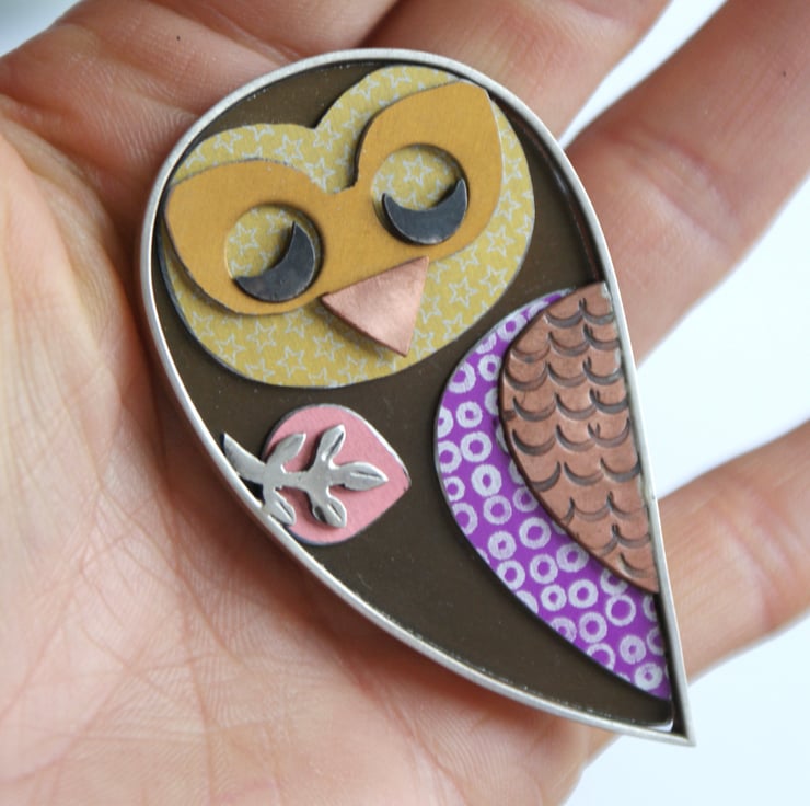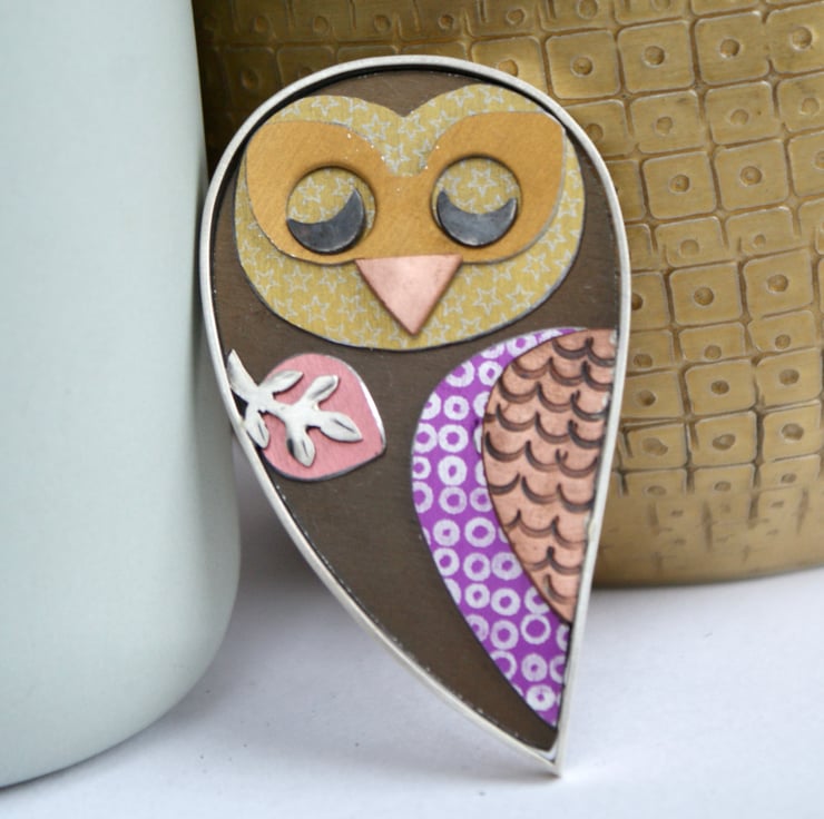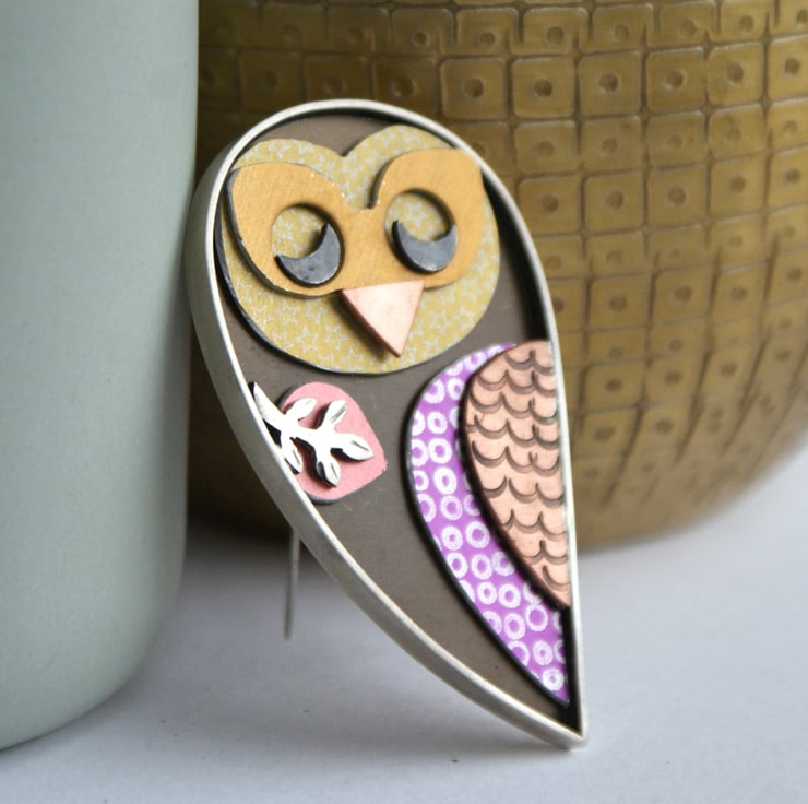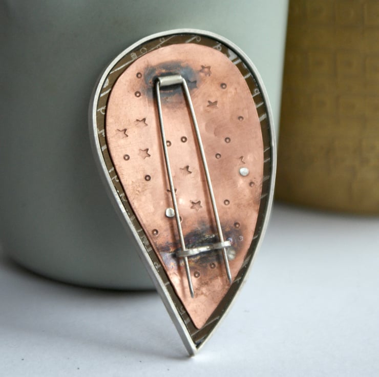 A quirky brooch hand made from sterling silver, copper, and anodised aluminium. The coloured pieces are patterned aluminium and copper that have been layered within the silver framework. The silver is polished to a satin finish.