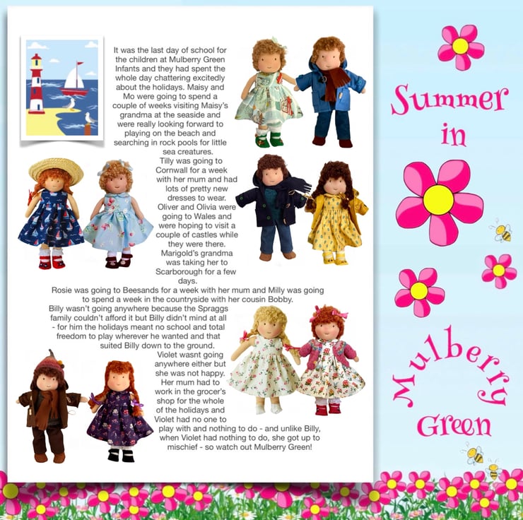 There are other children in Maisy’s class at school - Violet, Billy with his pet rabbit, Amber, Tilly, Rosie and her kittens, Amelia, Ruby, Marigold, Bobby with Max the dog, and the twins Oliver and Olivia, who have a puppy called Oscar. The dolls are all 26cm tall and baby Daisy is 16cm. Maisy and Mo love nothing more than having adventures with their friends. You can read about their adventures on my Facebook and Instagram pages - Maisy Muffin Rag Dolls and on my Mulberry Green Pinterest boards.