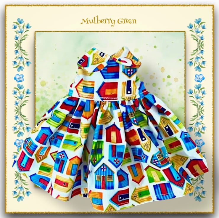A cute little dress in a beach huts print, to fit the Mulberry Green characters. The dress has a Peter Pan collar and a lined bodice. Perfect for the seaside.