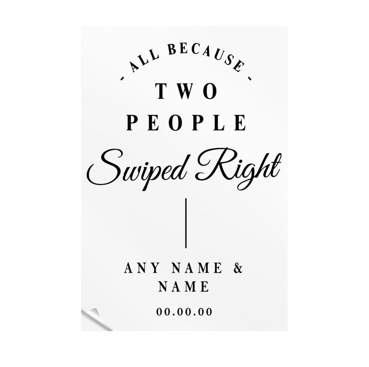 Was your happy ever after found online? Celebrate your love story with our custom "All Because Two People Swiped Right" mirror/sign sticker, perfect for engagement parties, weddings, or anniversary celebrations. Personalise this elegant design with two names (up to 9 characters each) and a special date to create a unique and memorable decoration. Available in a variety of colours and sizes, this sticker will add a personal touch to any event.