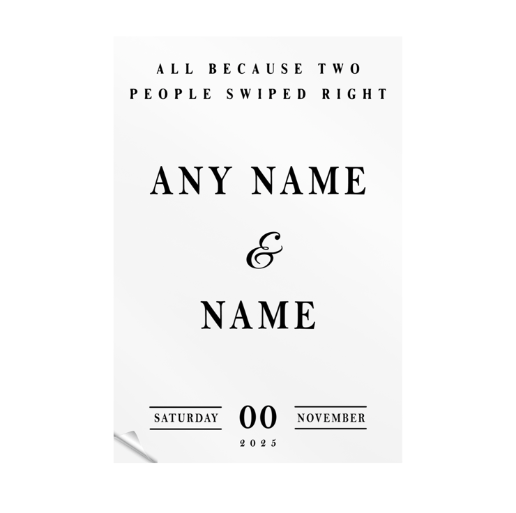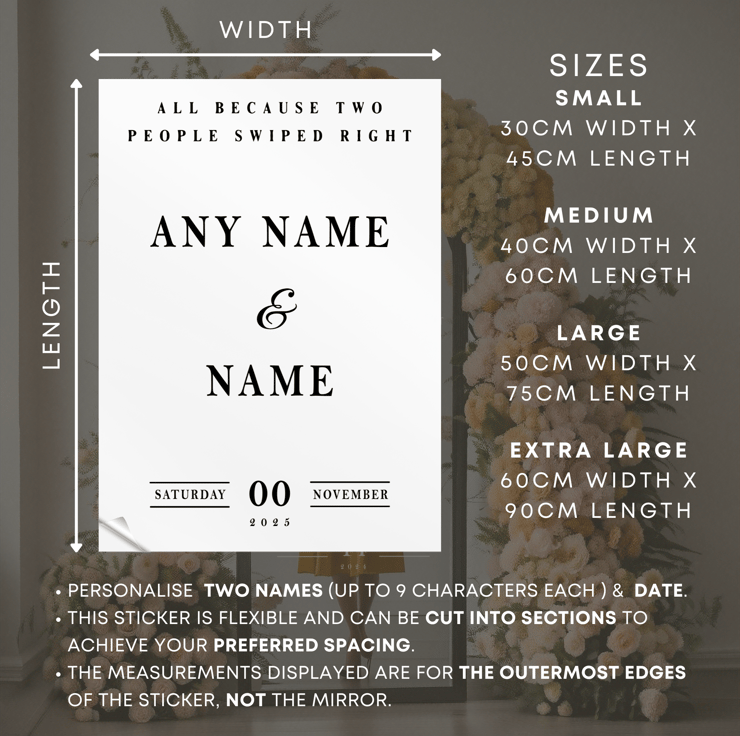 Was your happy ever after found online? Celebrate your love story with our custom "All Because Two People Swiped Right" mirror/sign sticker, perfect for engagement parties, weddings, or anniversary celebrations. Personalise this elegant design with two names (up to 9 characters each) and a special date to create a unique and memorable decoration. Available in a variety of colours and sizes, this sticker will add a personal touch to any event.