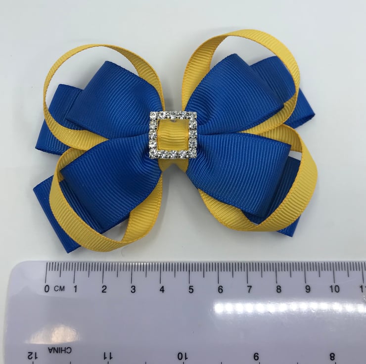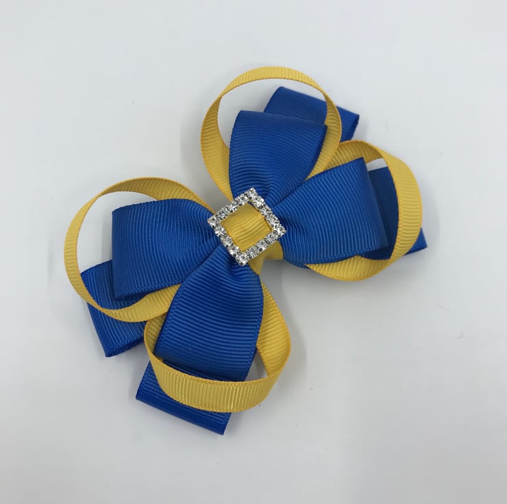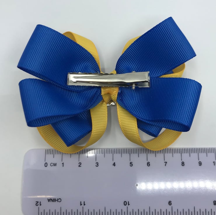 Our double bows are handmade here in our little shop. They are made from the best quality Grosgrain ribbon. These bows are really elegant and look extremely smart and go well with the royal blue and yellow gold School Uniform.
