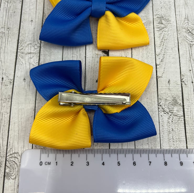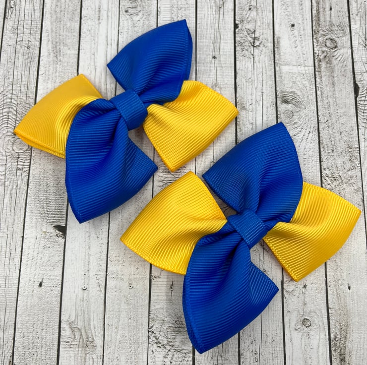 Our square double bows are handmade here in our little shop. They are made from the best quality Grosgrain ribbon. These bows are simple and classic and look extremely smart and go well with the royal blue and yellow gold School Uniform.