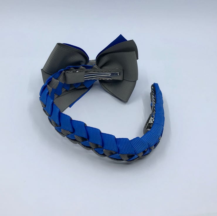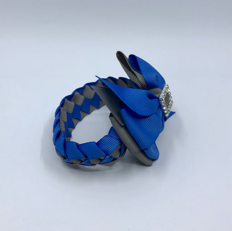Our royal blue and grey Bunwrap is handmade here in our little shop. It is made from the best quality Grosgrain ribbon. The Bunwrap is really elegant and look extremely smart wrapped around your little one's bun. It clips in at the front of the bun then the tail wraps around the bun and clips beneath the bow at the front to complete the look, tail is 21 cm.