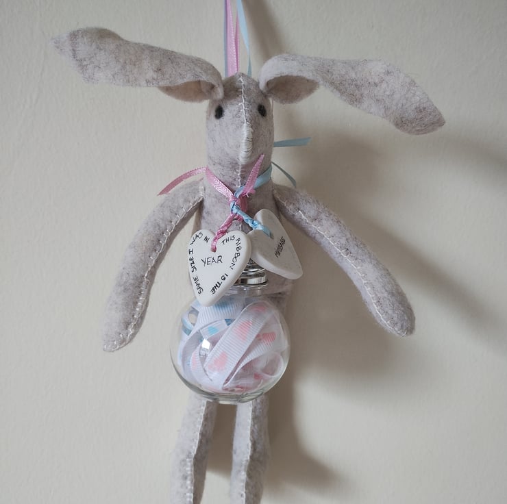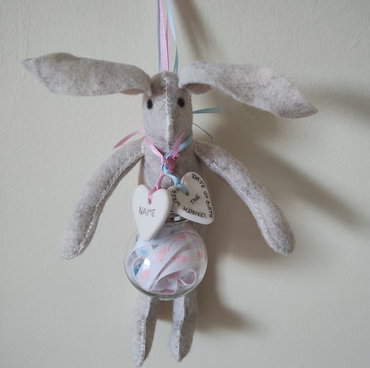 This beautiful Keepsake New Born Bunny comes with 1 Bauble and 1 Bunnies along with 2 Ceramic Hearts capturing all those precious details from the day they arrived into your life. The shatterproof bauble contains a piece of ribbon the length of your baby. The ceramic hearts will show their NAME and on the reverse 'This ribbon is the same size I was in 2024' The second heart will show their DATE OF BIRTH, TIME OF BIRTH, LENGTH and WEIGHT. On the reverse there is room for a very short message (see photograph). There are many colours for you to chose from (see photograph)