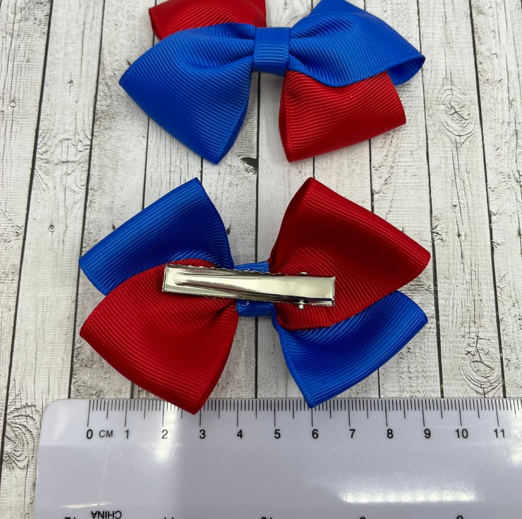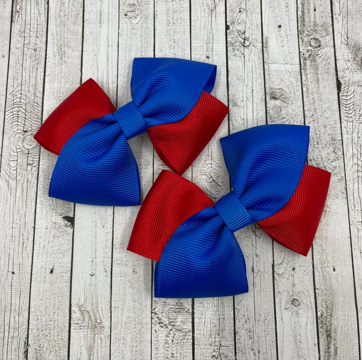 Our diagonal double bows are handmade here in our little shop. They are made from the best quality Grosgrain ribbon. These bows are simple and classic and look extremely smart and go well with the royal blue and red School Uniform.