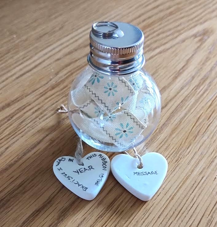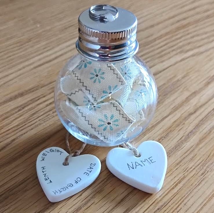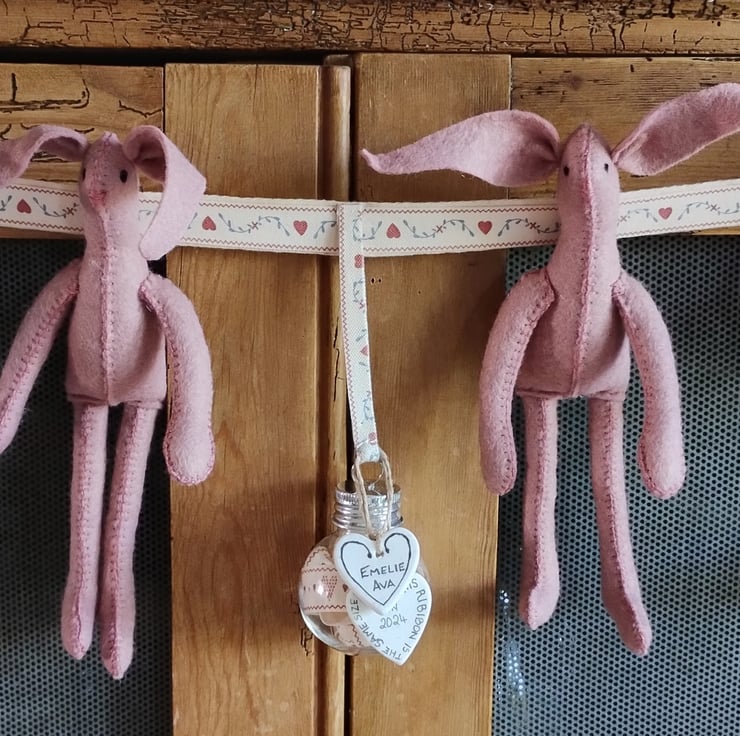 This beautiful Keepsake New Born Baby's Bauble comes with 1 Bauble, 2 Bunnies and 2 Linen Hearts capturing all those precious details from the day they arrived into your life. The shatterproof bauble contains a piece of ribbon the length of your baby. The linen hearts will show their NAME and 'This ribbon is the same size I was in 2025' The second heart will show DATE OF BIRTH, TIME OF BIRTH, LENGTH and WEIGHT. There is room for a very short message (see photograph). You can select the two bunnies in any colour from wool felt selection shown in the photograph.