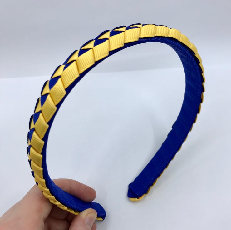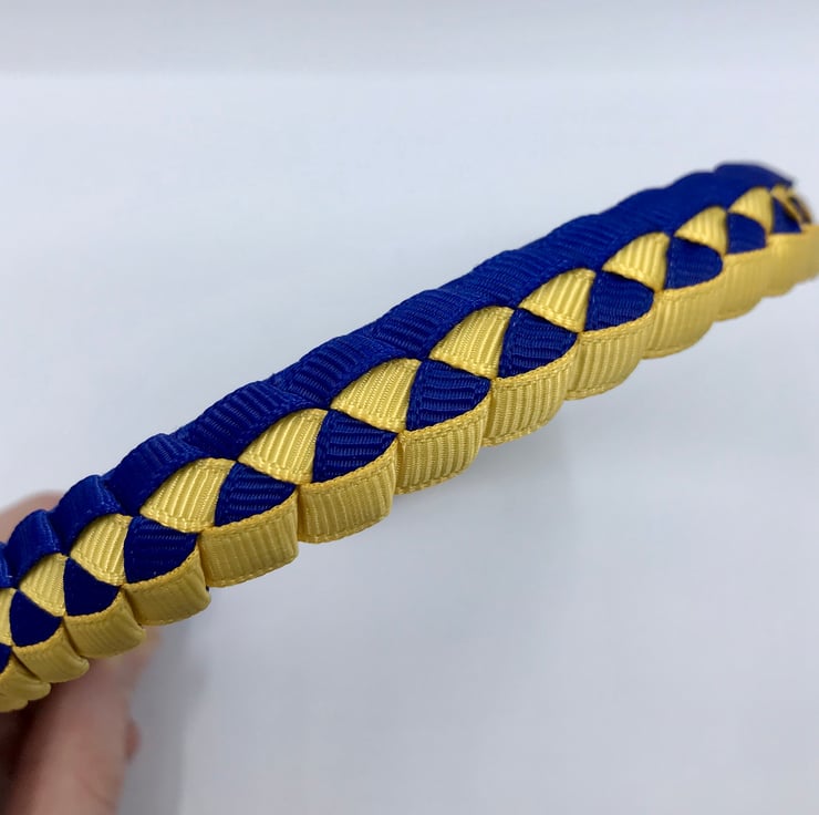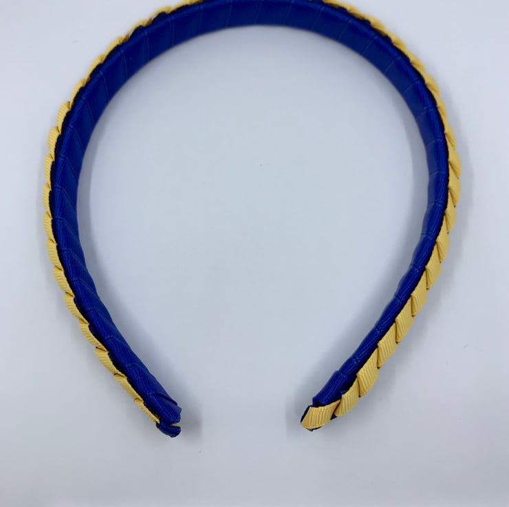 Our pleated hairbands are handmade here in our little shop. They are so cute the could compliment any school Uniform with cobalt blue and yellow gold in it. They are ideal for keeping those sneaky little curls from straying into your little one's eyes.