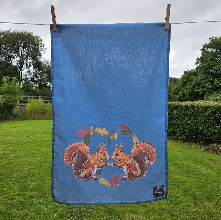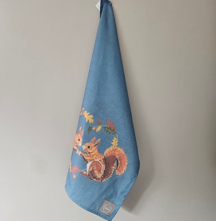 'Love' tea towel collection, featuring a printed design of 'Red Squirrels in Acorn heart' design.