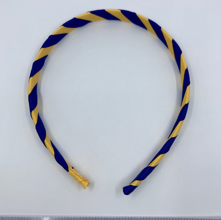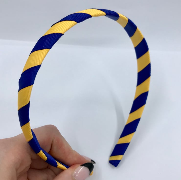 Our cobalt blue and yellow gold Ribbon 1.8cm striped head band is made with excellent quality grosgrain ribbon. It will match beautifully with your little one's school Uniform and keep those little stray curls out of your little one's eyes.