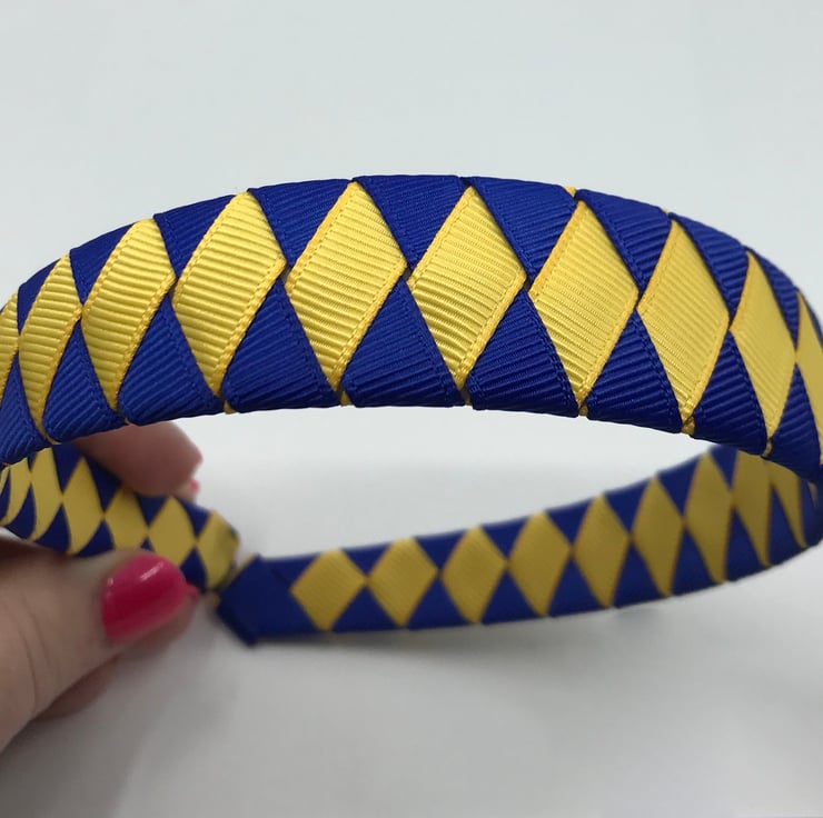 Our Diamond pleated hairbands are handmade here in our little shop. They are so cute the could compliment any school Uniform with cobalt blue and yellow gold in it. They are ideal for keeping those sneaky little curls from straying into your little one's eyes.