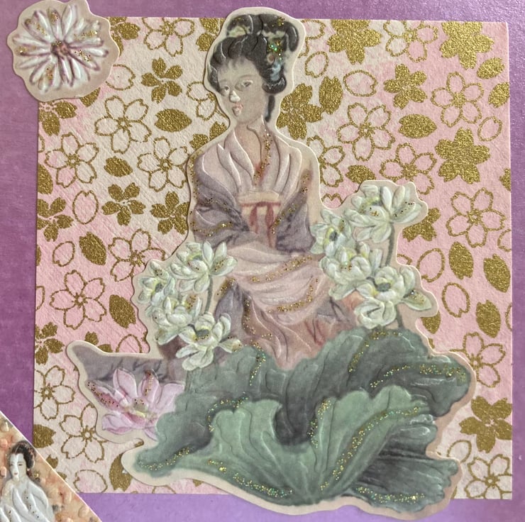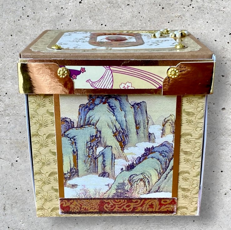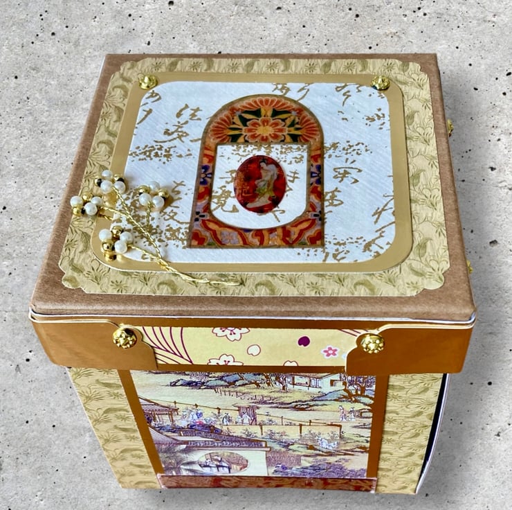 The outside of this box card has been decorated with a floral paper on a green background. Two gold foiled panels have been added, the front panel features a Japanese house scene and the back features mountains. The lid has been decorated with gold decorated paper and a raised design made from epoxy featuring a geisha and finished with gold and pearl effect flowers.
