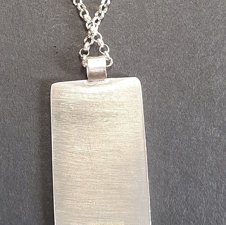 The pendant is finished with a high polish and suspended from a 45 cm sterling silver chain, attached via a sleek silver tube soldered to the top edge for a modern, elegant look.