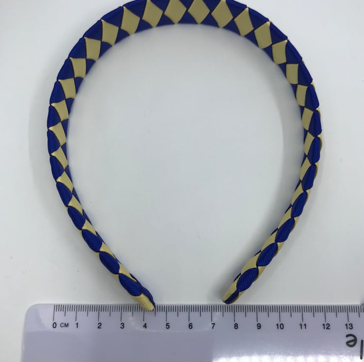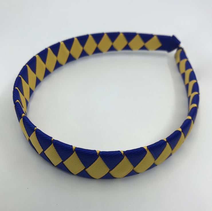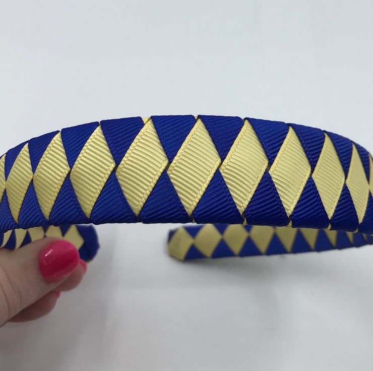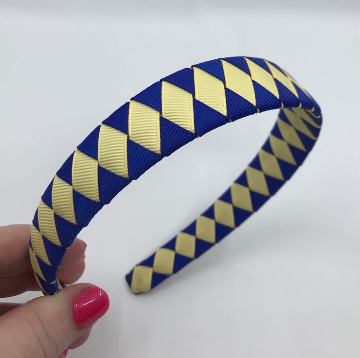 Our Diamond pleated hairbands are handmade here in our little shop. They are so cute the could compliment any school Uniform with cobalt blue and pale yellow in it. They are ideal for keeping those sneaky little curls from straying into your little one's eyes.