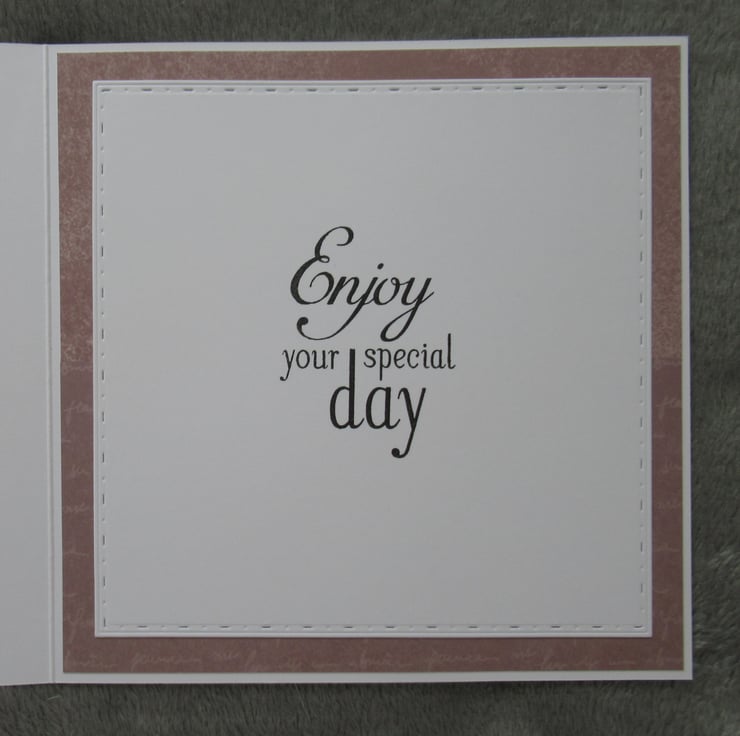 This pretty dusky pink/neutral toned card featuring a cartoon cat and dog with a big birthday cake, has been made using quality patterned papers. I have used dies to cut decorative frames for the image and placed these on different angles. I then added a white satin bow and a heart shaped birthday greeting for decoration and the inside has been finished to coordinate with a stamped message which reads 'Enjoy Your Special Day'.