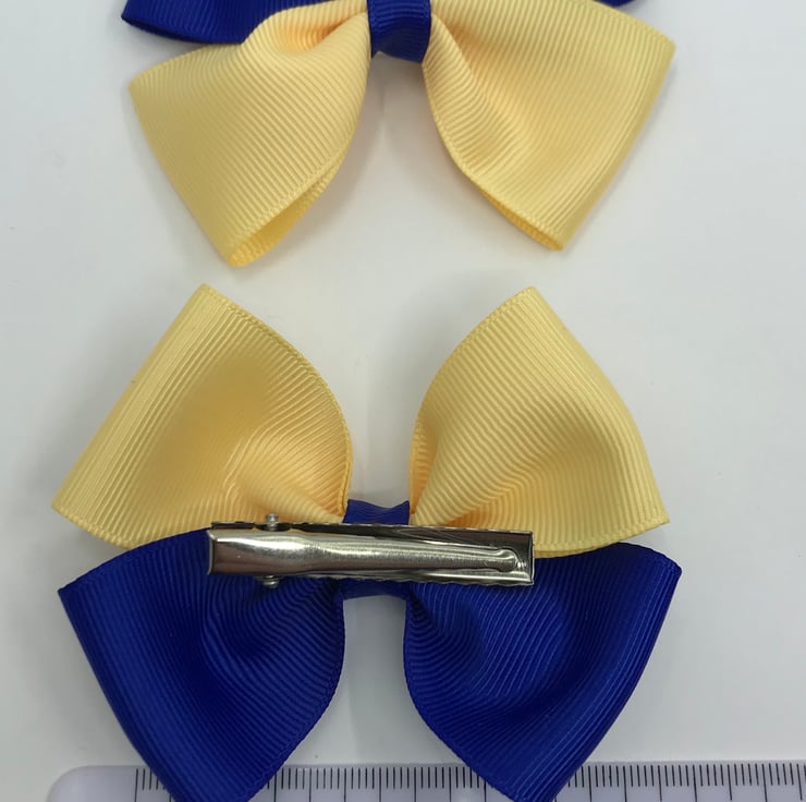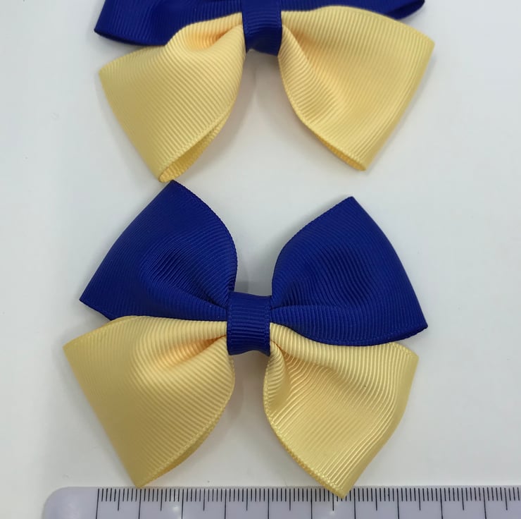 Our two tone double bows are handmade here in our little shop. They are made from the best quality Grosgrain ribbon. These bows are simple and classic and look extremely smart and go well with the royal blue and pale yellow School Uniform.