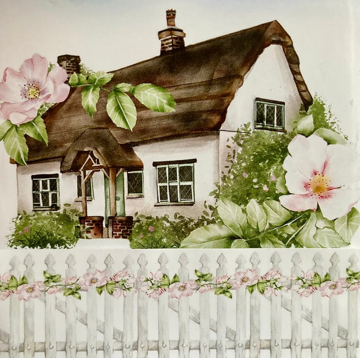 The outside of this box card has been decorated with a pink spotty paper overlaid with images from a cottage garden scene and the words Many Happy Returns.