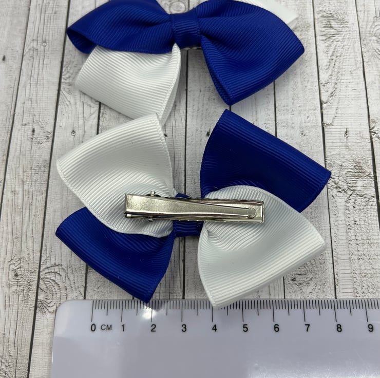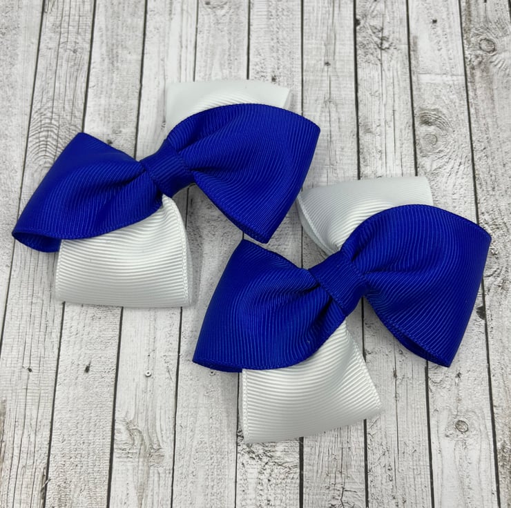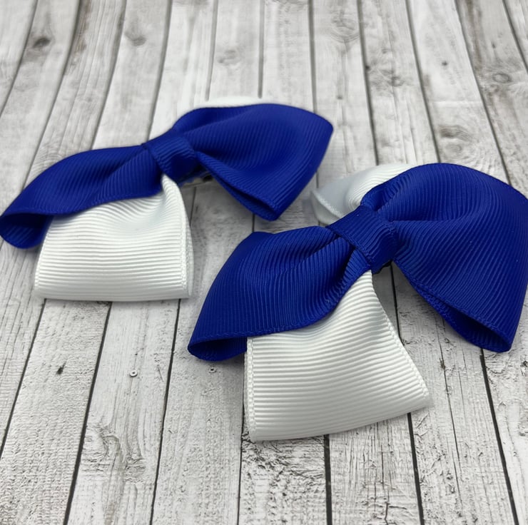 Our diagonal double bows are handmade here in our little shop. They are made from the best quality Grosgrain ribbon. These bows are simple and classic and look extremely smart and go well with the cobalt blue and white School Uniform.