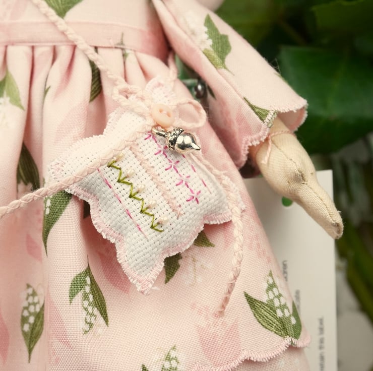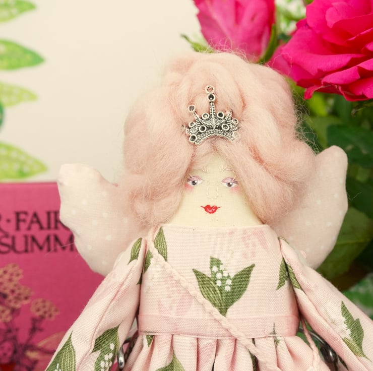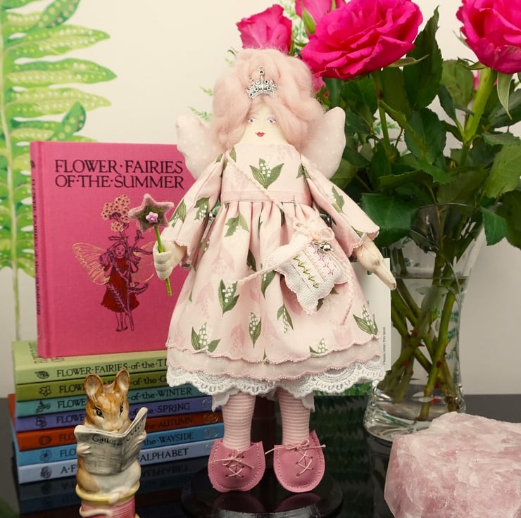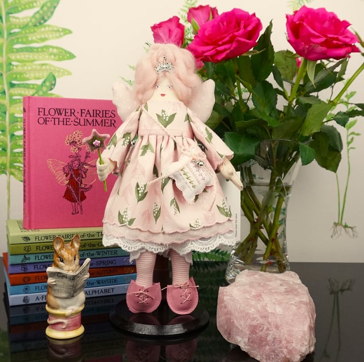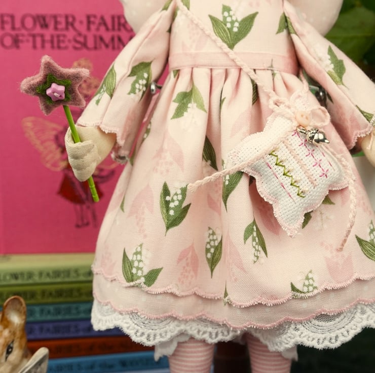 This is Lily. A smaller pattern, she is about two thirds the size of my witch. This little Fairy God Mother has a Lewis and Irene print dress in blush with lily of the valley flowers abounding from Flo's Wildflower collection. She has wings that match her underskirt and sports a little felt wand. Her shoes are the smallest I have ever made and are leather. She has a piece of rose quartz to her heart with rose petals flowers in her stuffing and is finished with tiny buttons, organza ribbon and a little coronet in her hair.
