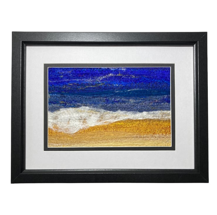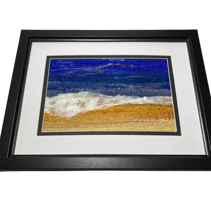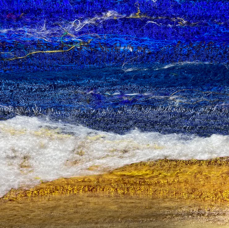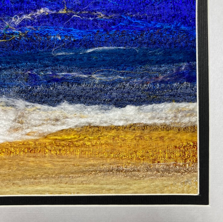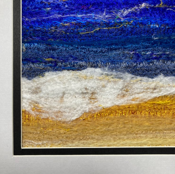 An original textile art picture with plenty of texture. Made using strips of silk fabric, combined with wool and silk fibres, this picture is of an ocean scene with waves crashing on the beach. The strips of silk are needle felted to a felt base and wool and silk fibres added to blend the colours and add detail. Needle felting binds the fabric and fibres together without the need for any stitching.