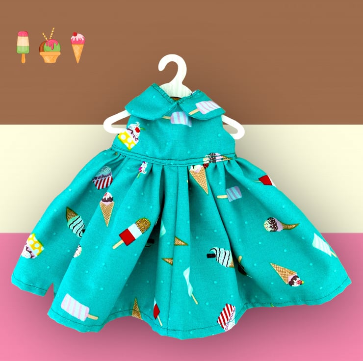 A sweet little dress in an ice creams print, to fit the Mulberry Green characters. The dress has a Peter Pan collar and a lined bodice. Perfect for the seaside.