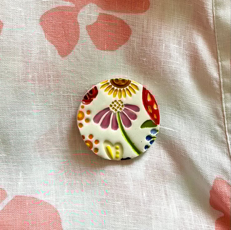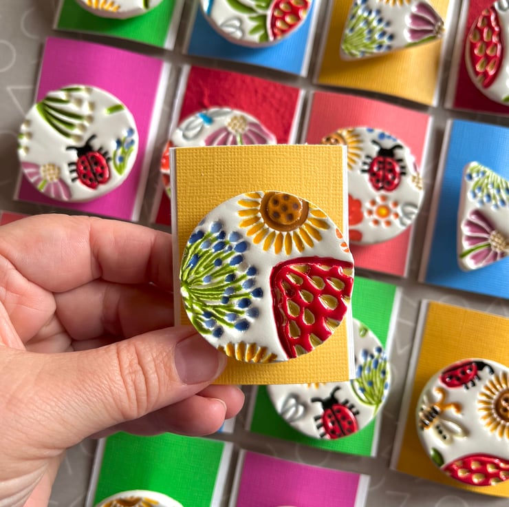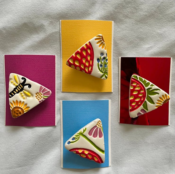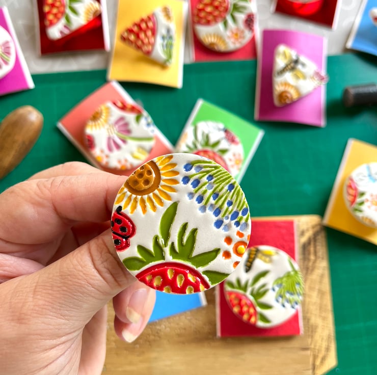 Next to the fun bit, applying colour! I hand paint each brooch using a combination of bright Summery toned underglaze colours. Before dipping in a glossy transparent glaze and firing for the final time. A brooch pin is then attached to each piece and ta-da it’s ready to wear!