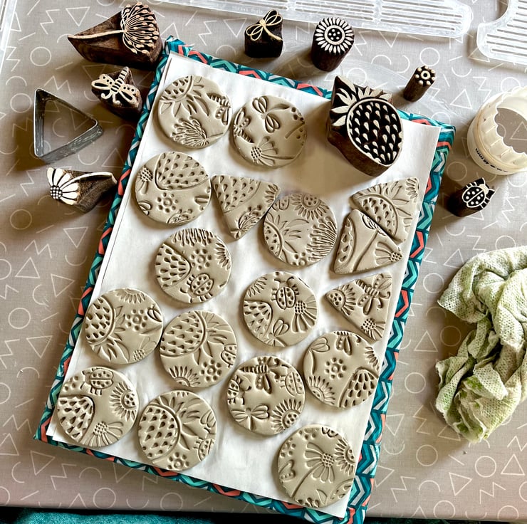 Made from white earthenware clay, this series of textured brooches are handmade from start to finish. Initially texture is applied to the surface of the clay using a series of decorative Summery wooden blocks. Each piece is then air dried for several days before being kiln fired to form bisqueware.