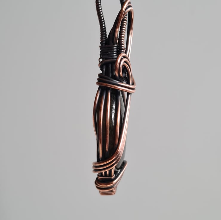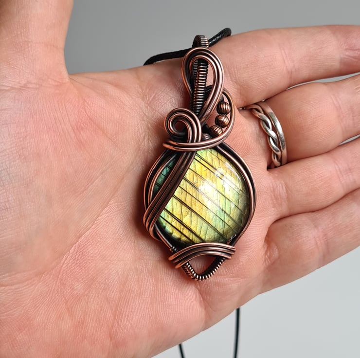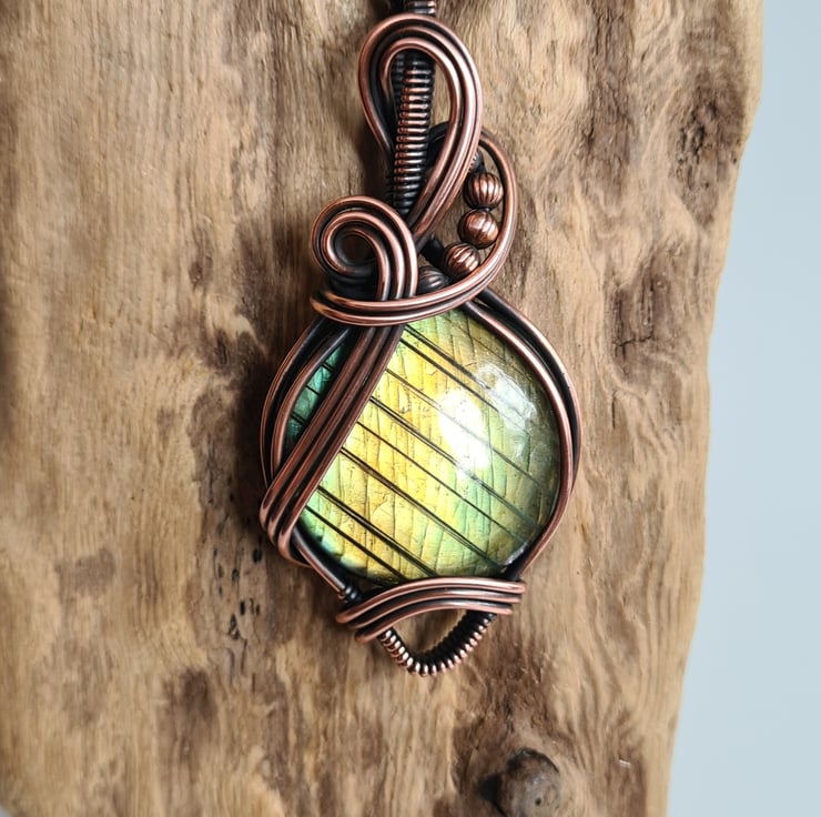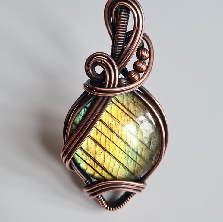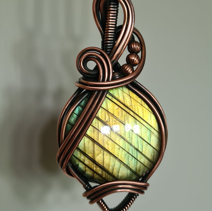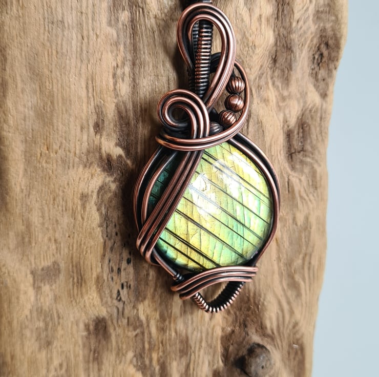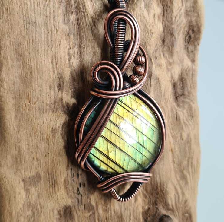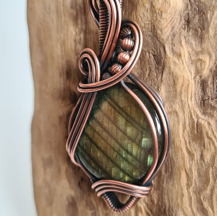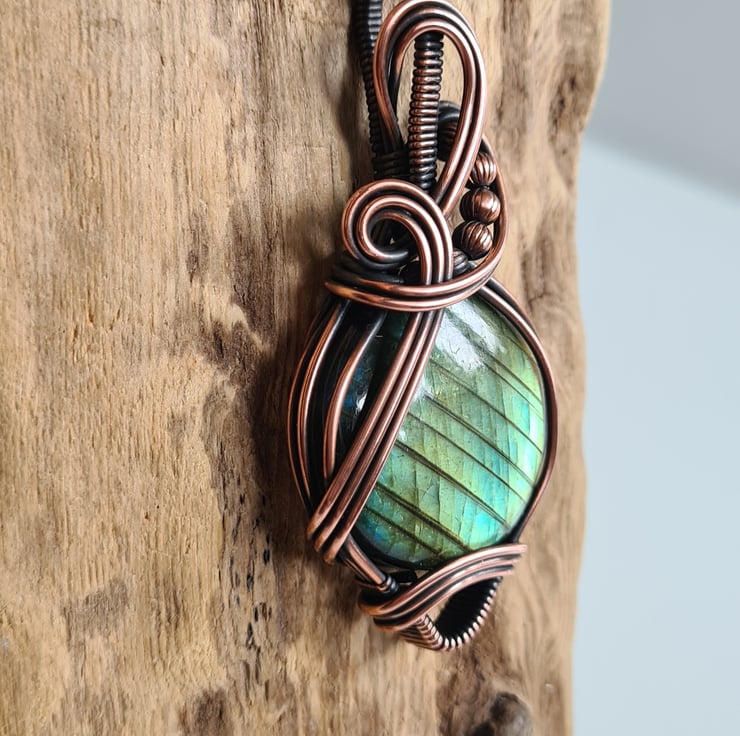 This gorgeous and large Natural Labradorite crystal is a beautiful green colour and has a beautiful shimmer, shine and pattern. I have wrapped this stone with copper into this unique design and then antiqued and polished for the final effect.