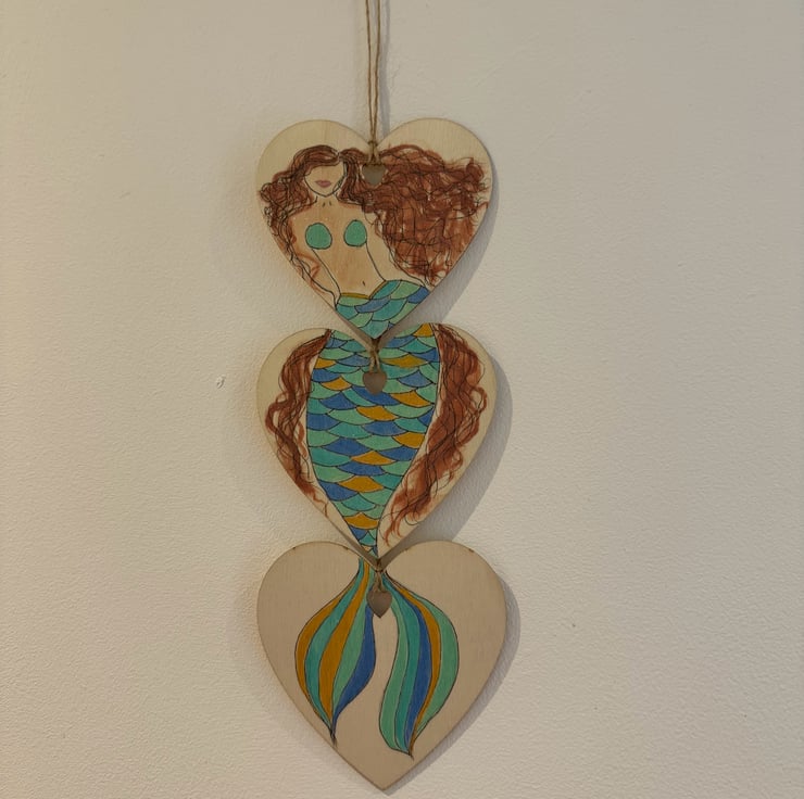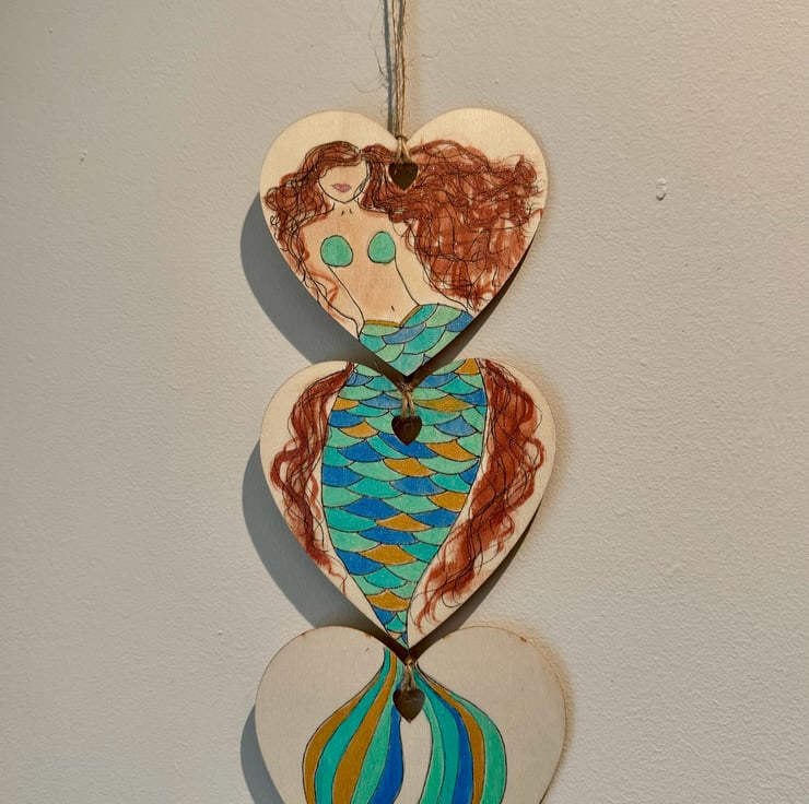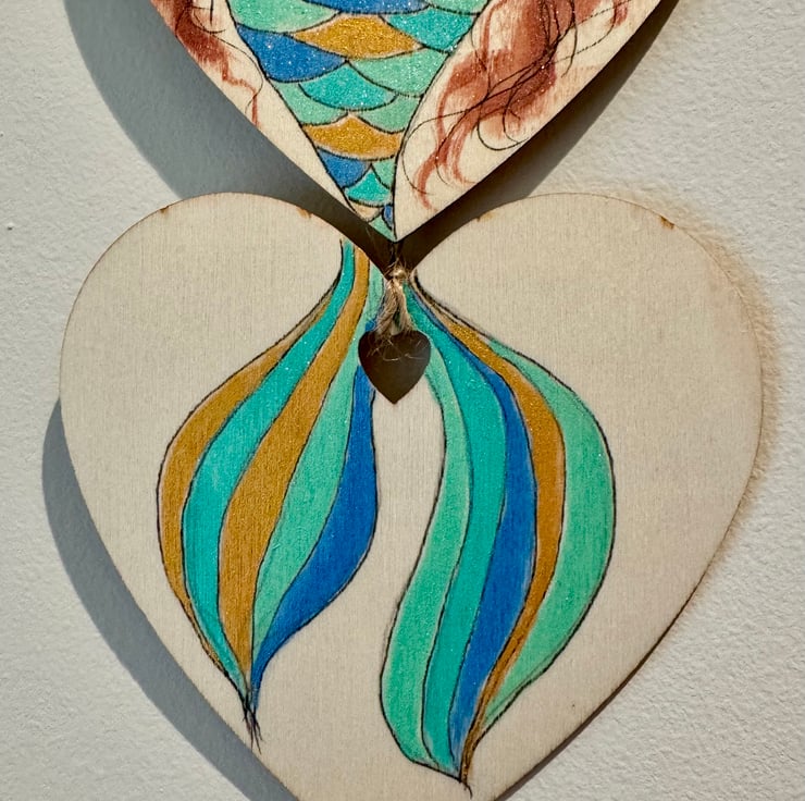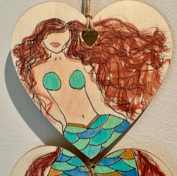 This gorgeous mermaid picture is hand drawn and painted using shimmering watercolours by me. She measures approximately 27cm, plus a 9cm hanger. The picture is a one-off.