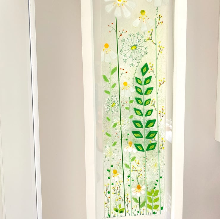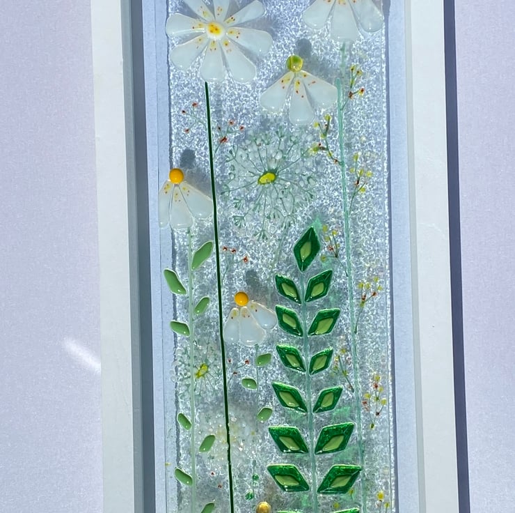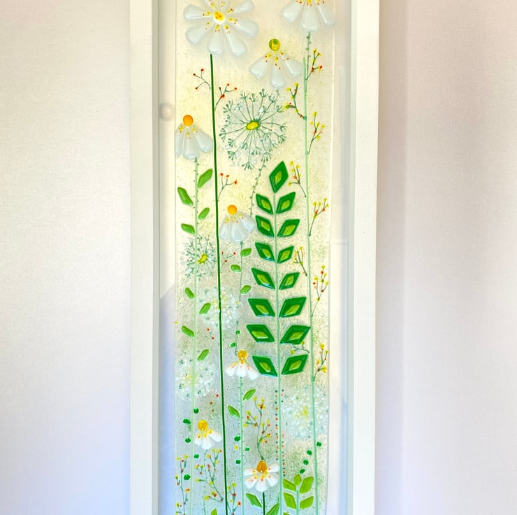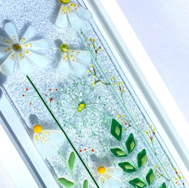 Beautiful wild daisies and dandelions against greenery is such a pretty sight I wanted to replicate this in fused glass . This lovely picture is an original one of a kind picture sure to look stunning in any room .
