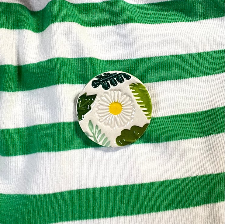 Handmade Ceramic Leafy Daisy brooch, Hand Made Badge